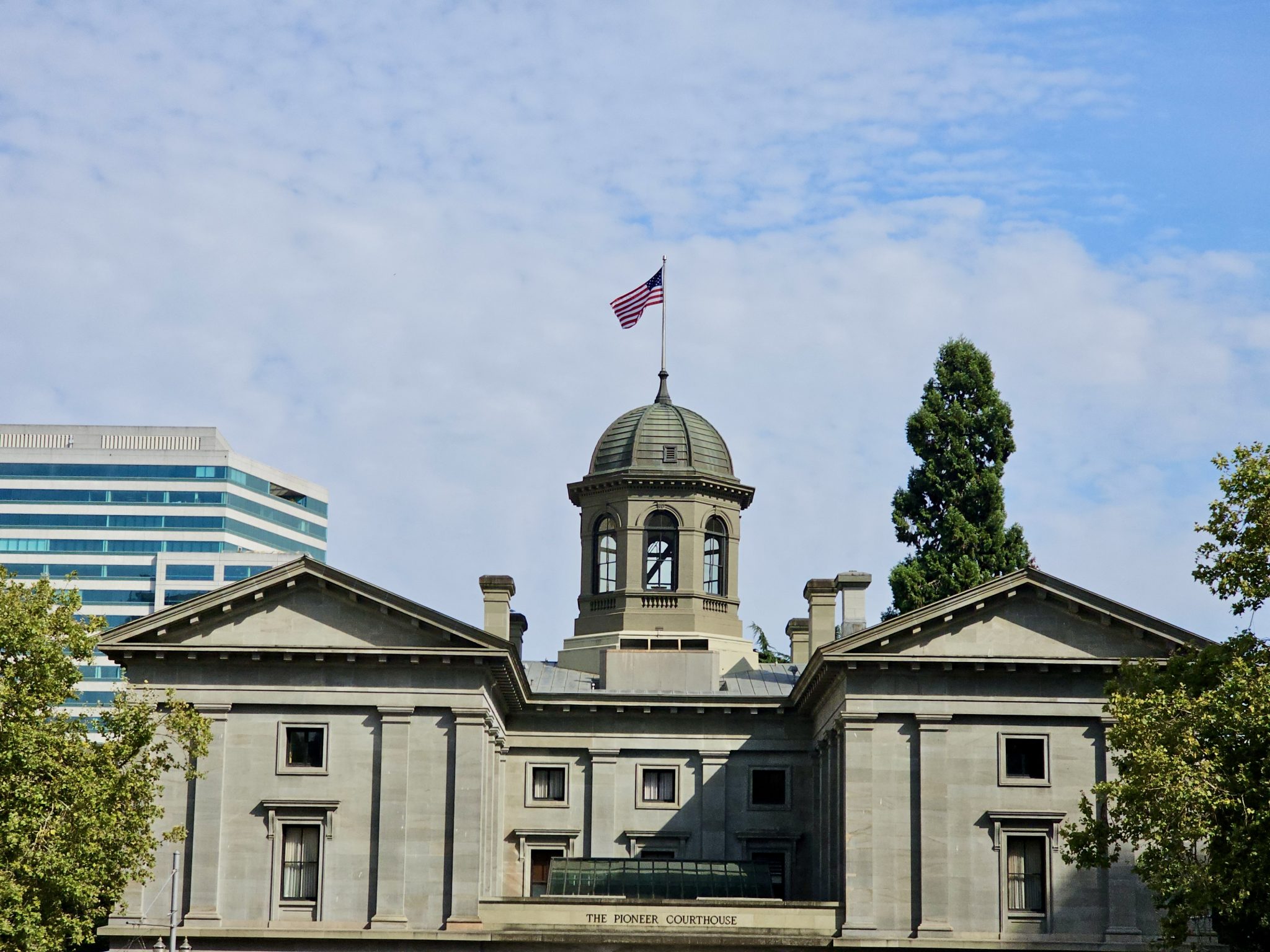 Alternative Text: The Pioneer Courthouse in Portland, Oregon, a historic federal building with a distinctive dome and classical architecture.