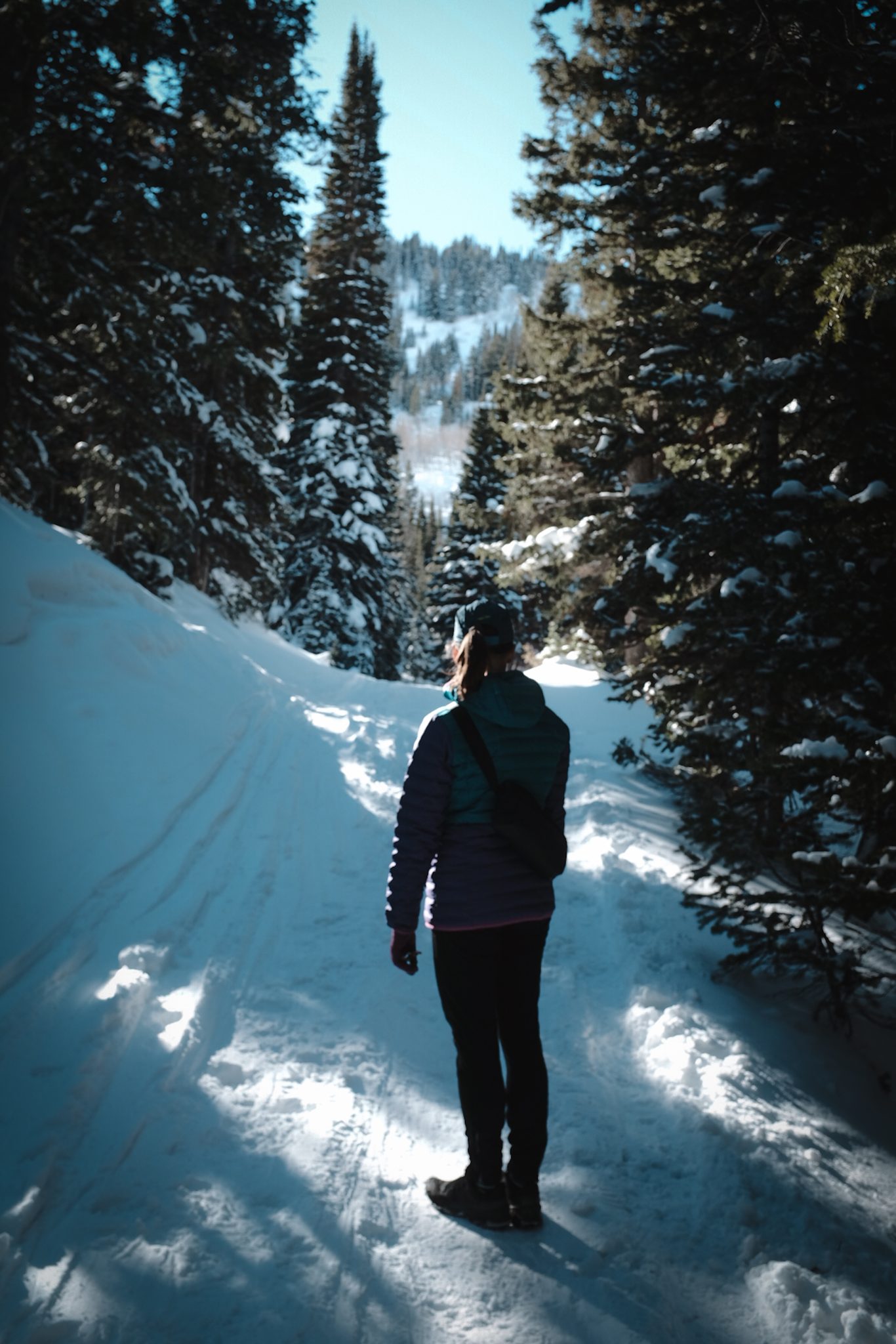Alternative Text: Person standing amongst a snowy forest in a beam of light, looking out at the view.
