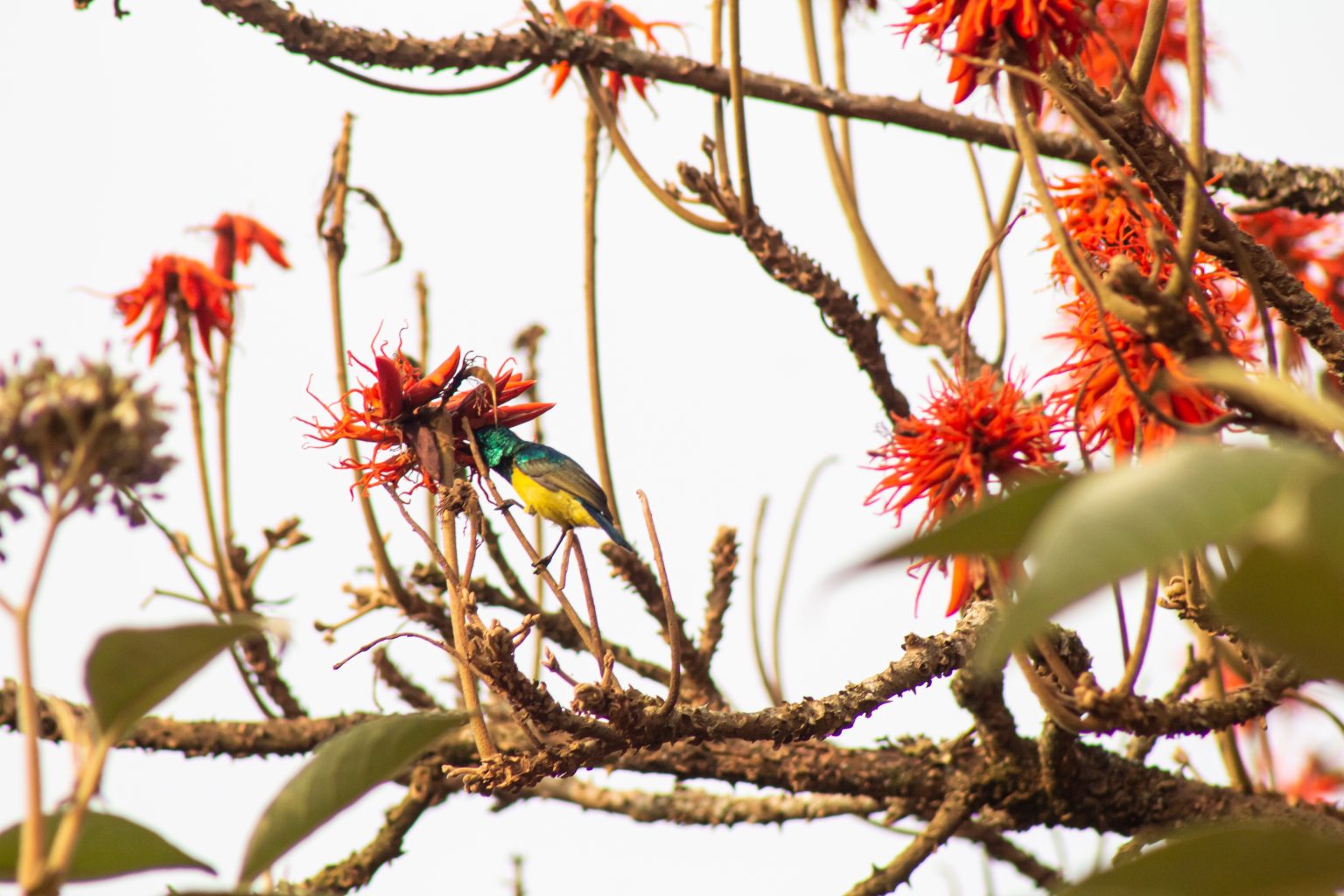 Alternative Text: A bird sucks nectar from a flower in a bright sunny evening