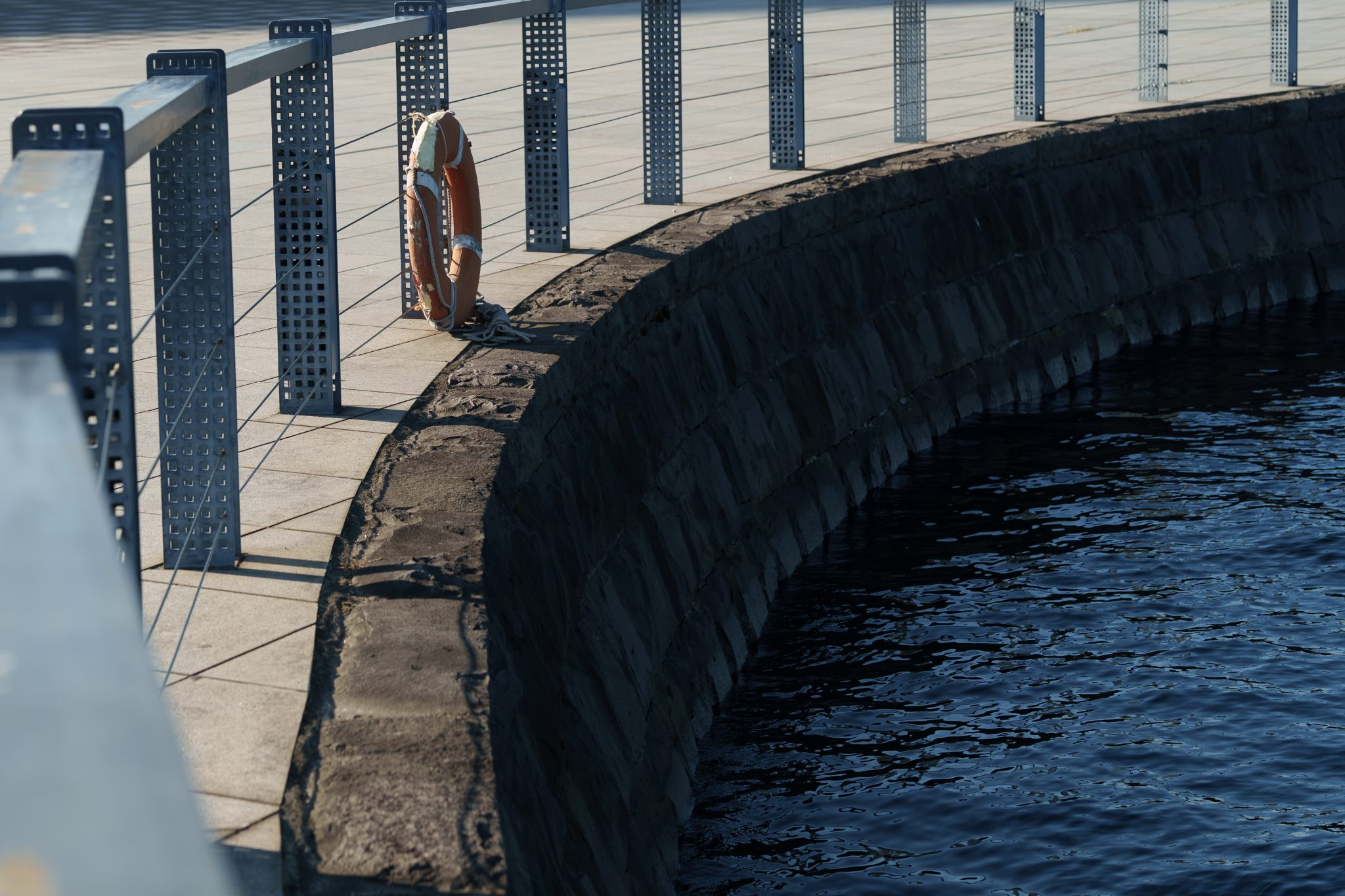 Alternative Text: A lifebuoy hangs along a curved waterfront with a stone wall and steel railing. The calm, dark blue water reflects the soft afternoon light.