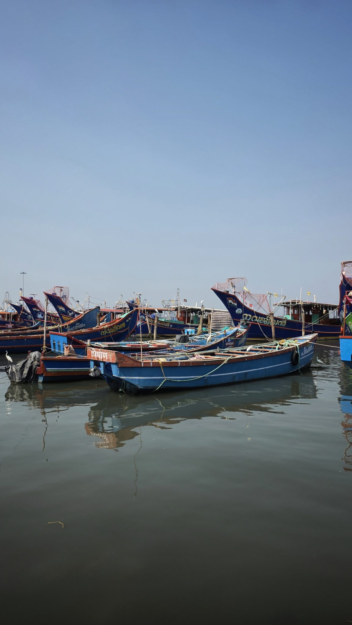 Alternative Text: Blue fishing boats anchored in a harbor in Kochi, Kerala, India, under a clear sky.