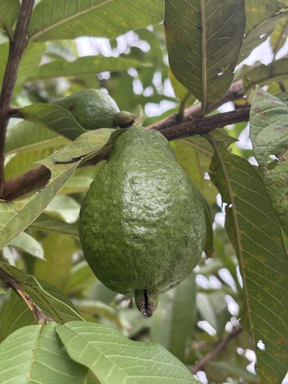 Alternative Text: A close-up image of a green guava hanging from a branch, surrounded by green leaves.