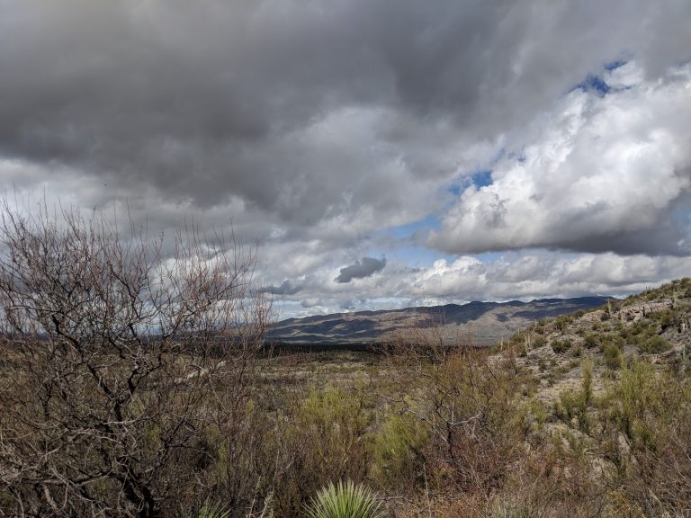 Alternative Text: Low clouds over a dessert hill in Arizona