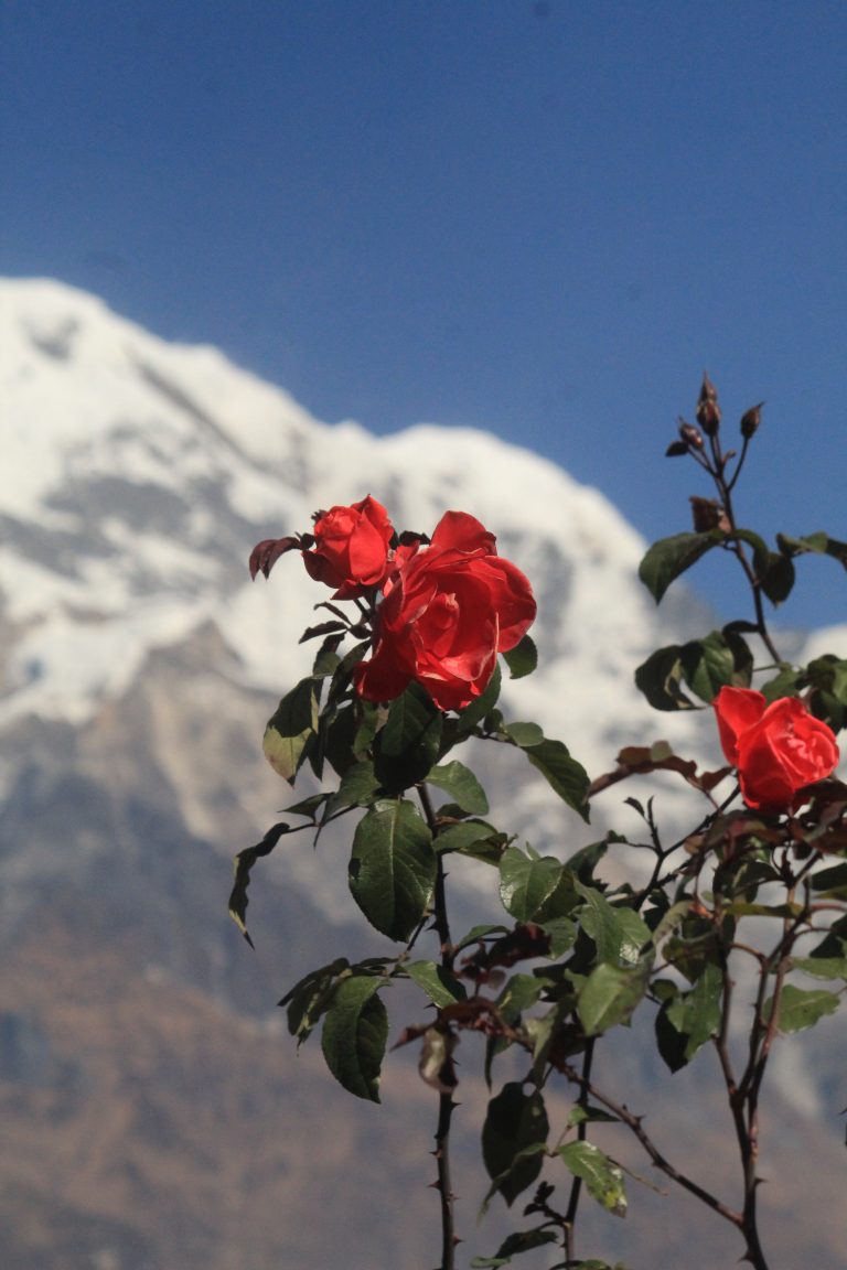 Alternative Text: A close-up view of vibrant red roses with lush green leaves in the foreground, set against a backdrop of snow-capped mountains under a clear blue sky