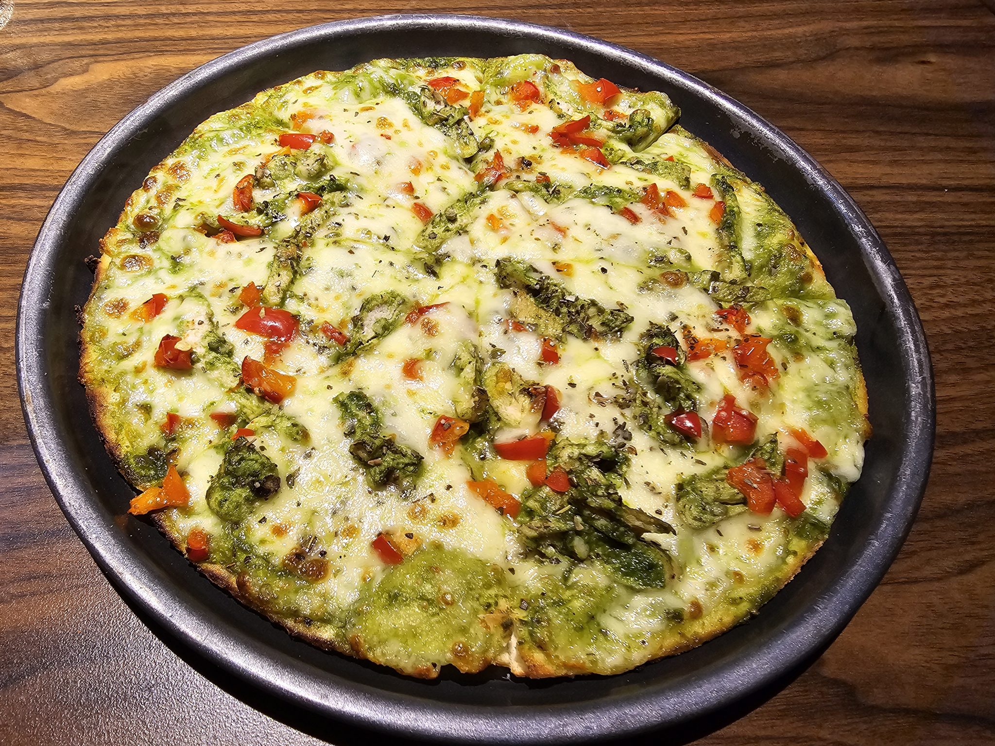 Alternative Text: A freshly baked Pesto Chicken pizza on a dark gray plate, featuring a green pesto base, melted cheese, and toppings of red bell peppers and asparagus. The pizza is cut into slices and presented on a wooden table, highlighting the vibrant colors and textures of the ingredients. Captured from Kozhikode, Kerala.