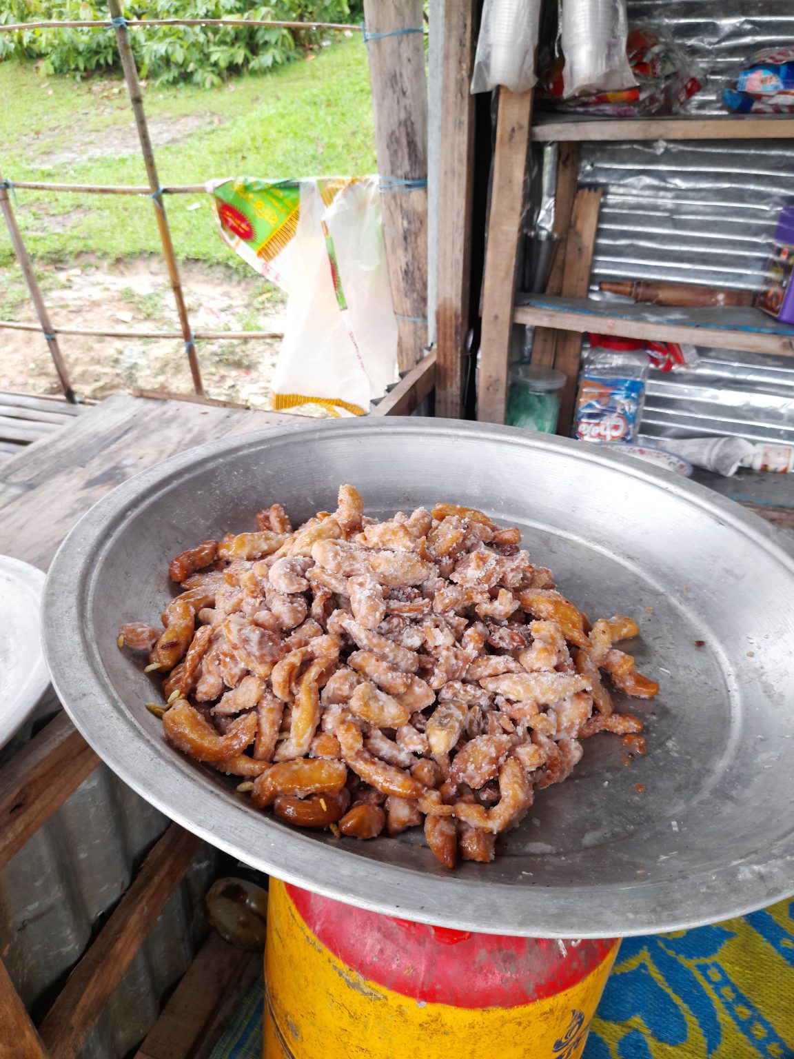 Alternative Text: A metal pan displaying a serving of food, highlighting its texture and vibrant colors.