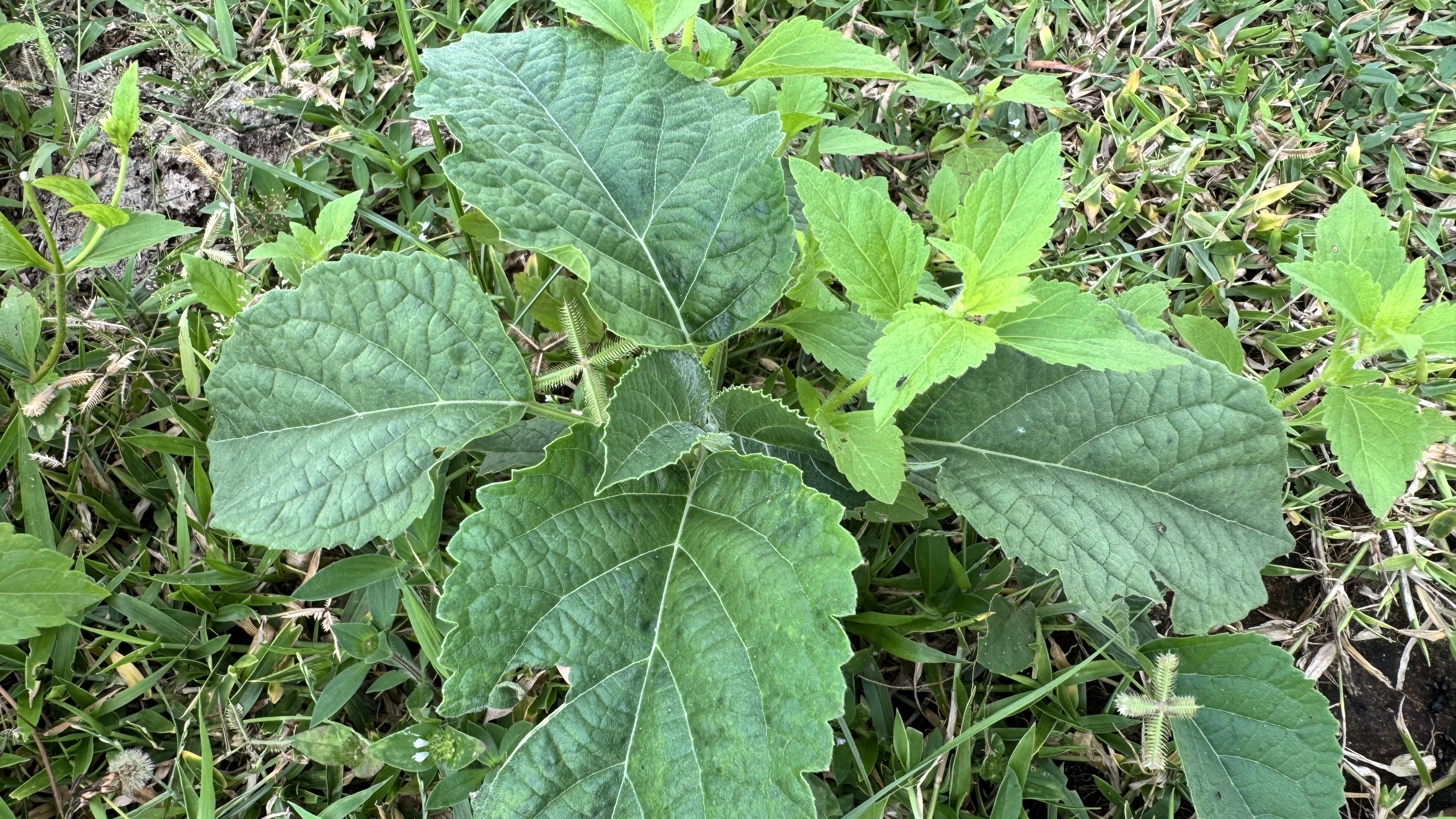 Alternative Text: A close-up view of a cluster of green leaves on a patch of grass.