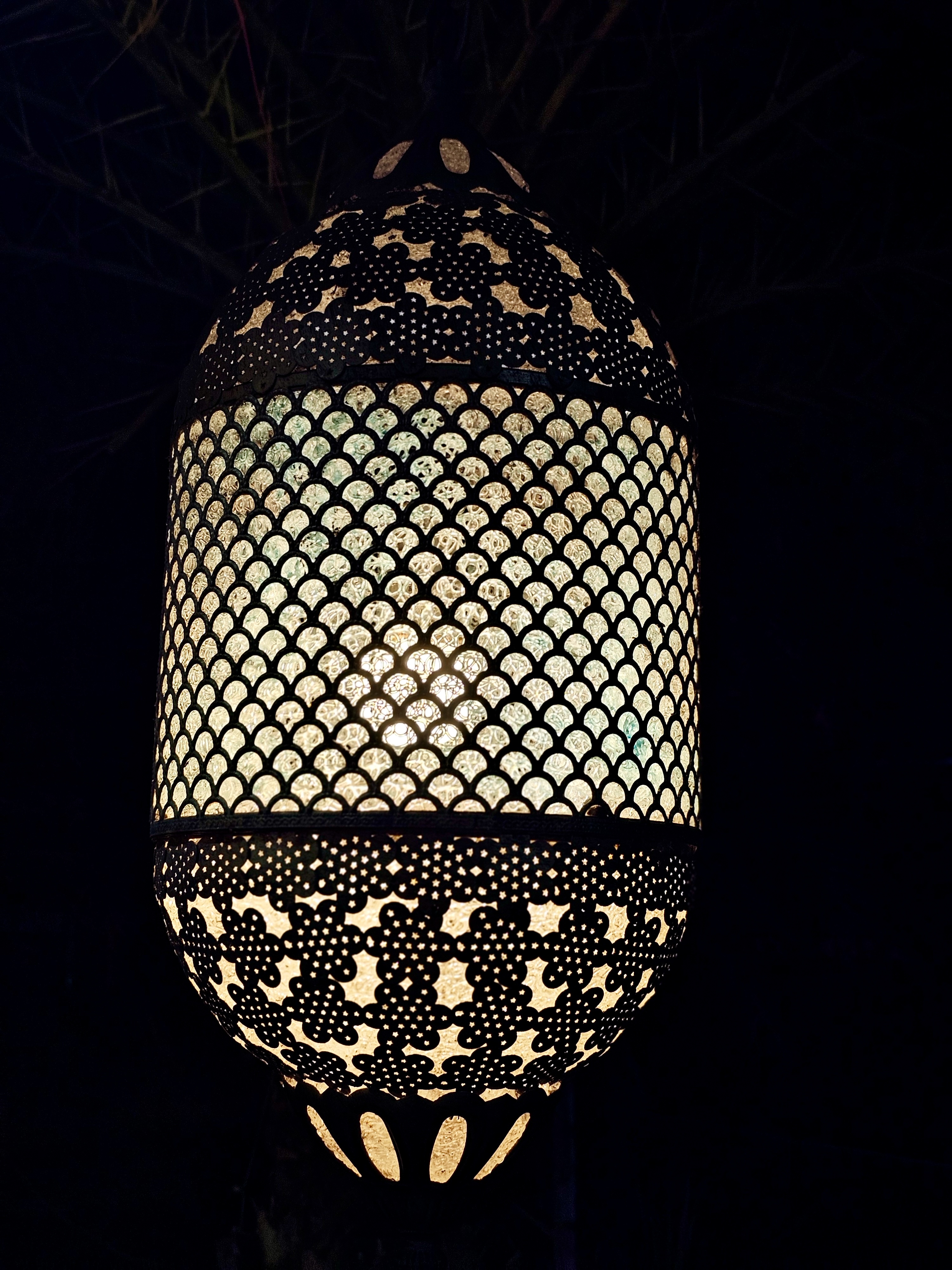 Alternative Text: A Moroccan-style metal hanging pendant light with an antique finish and intricate cutwork patterns.