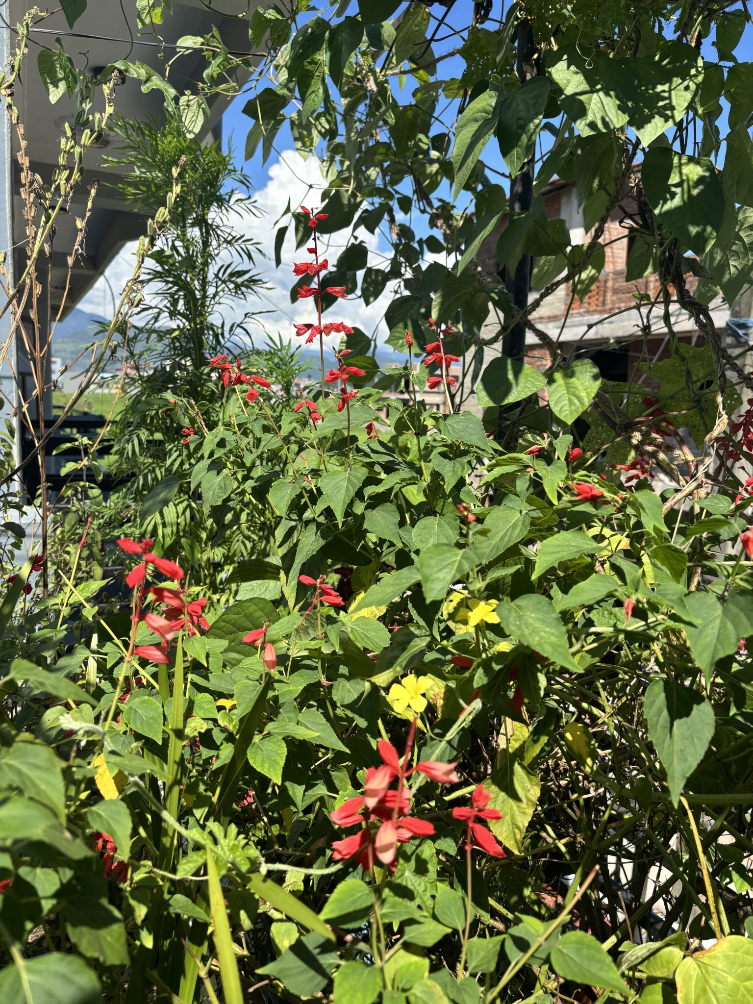 Alternative Text: A lush garden scene filled with vibrant green leaves and clusters of red and yellow flowers.