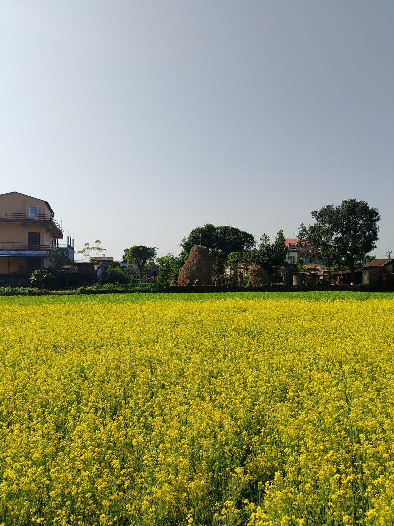 Alternative Text: A vibrant field of bright yellow mustard with buildings, trees, and a haystack under a clear blue sky.