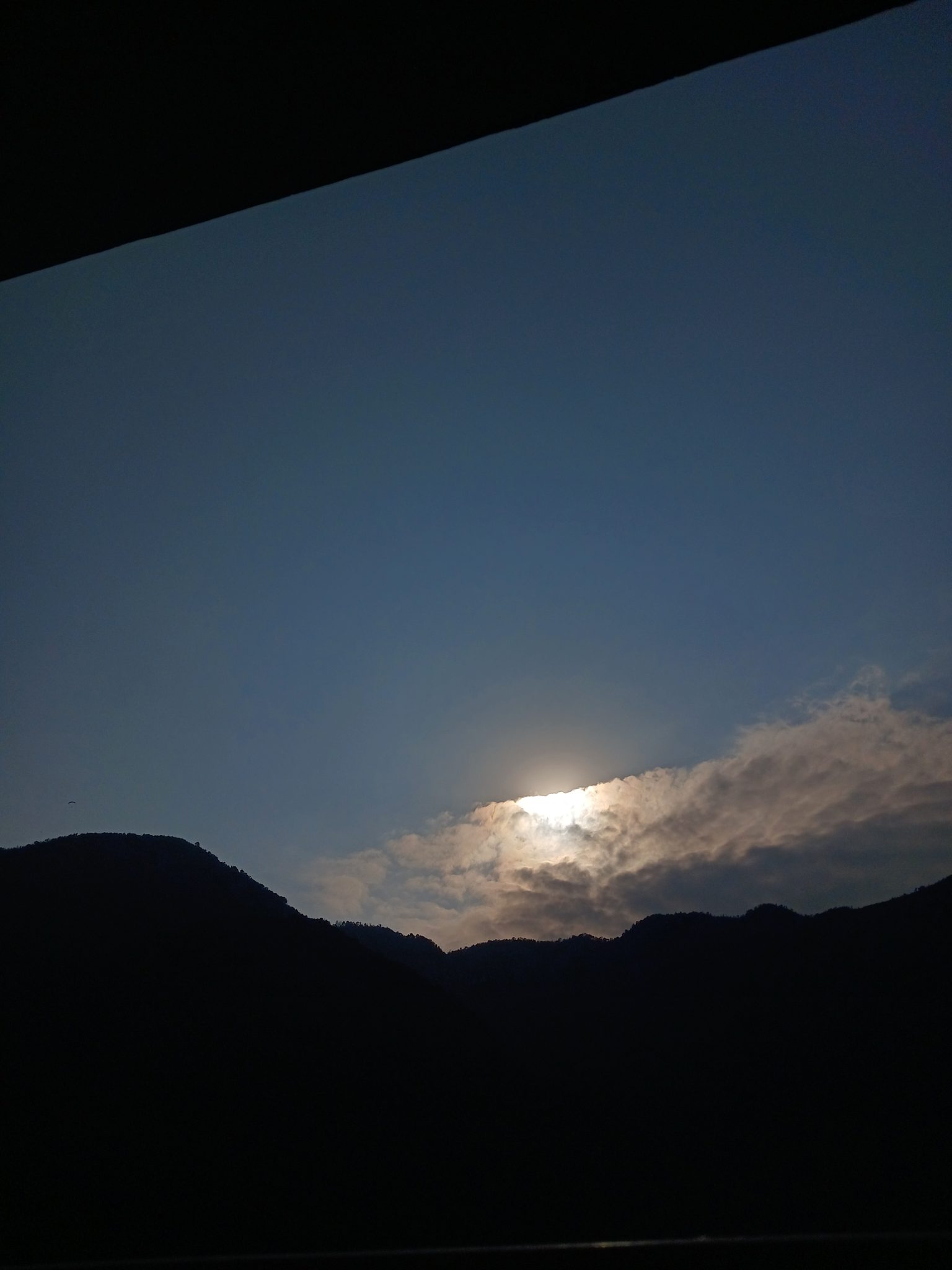 Alternative Text: A silhouette of mountains under a darkening sky, with the sun partially obscured by clouds