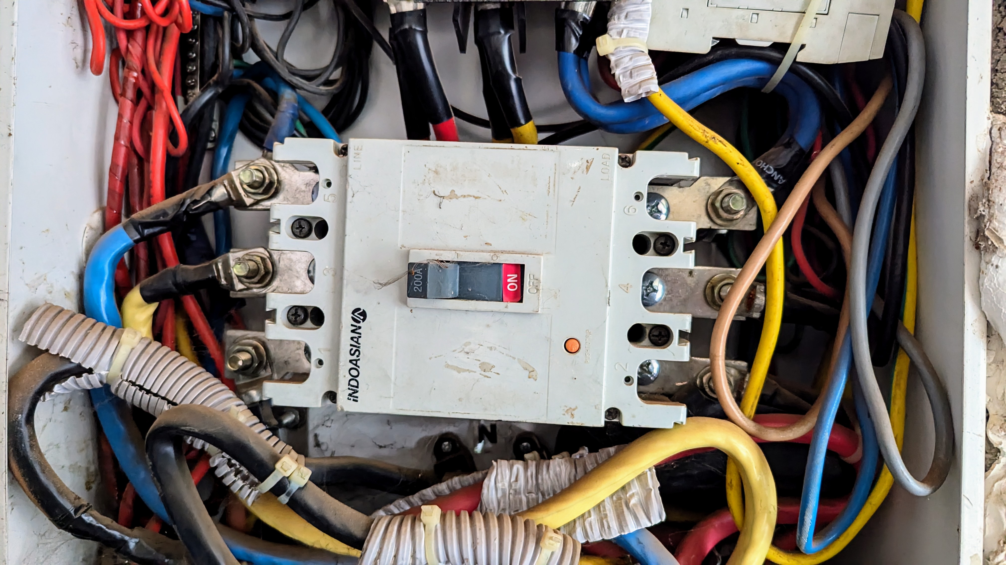 Alternative Text: Close-up of a 200-amp breaker in the ON position, with red, black, blue, yellow, and brown wires connected.