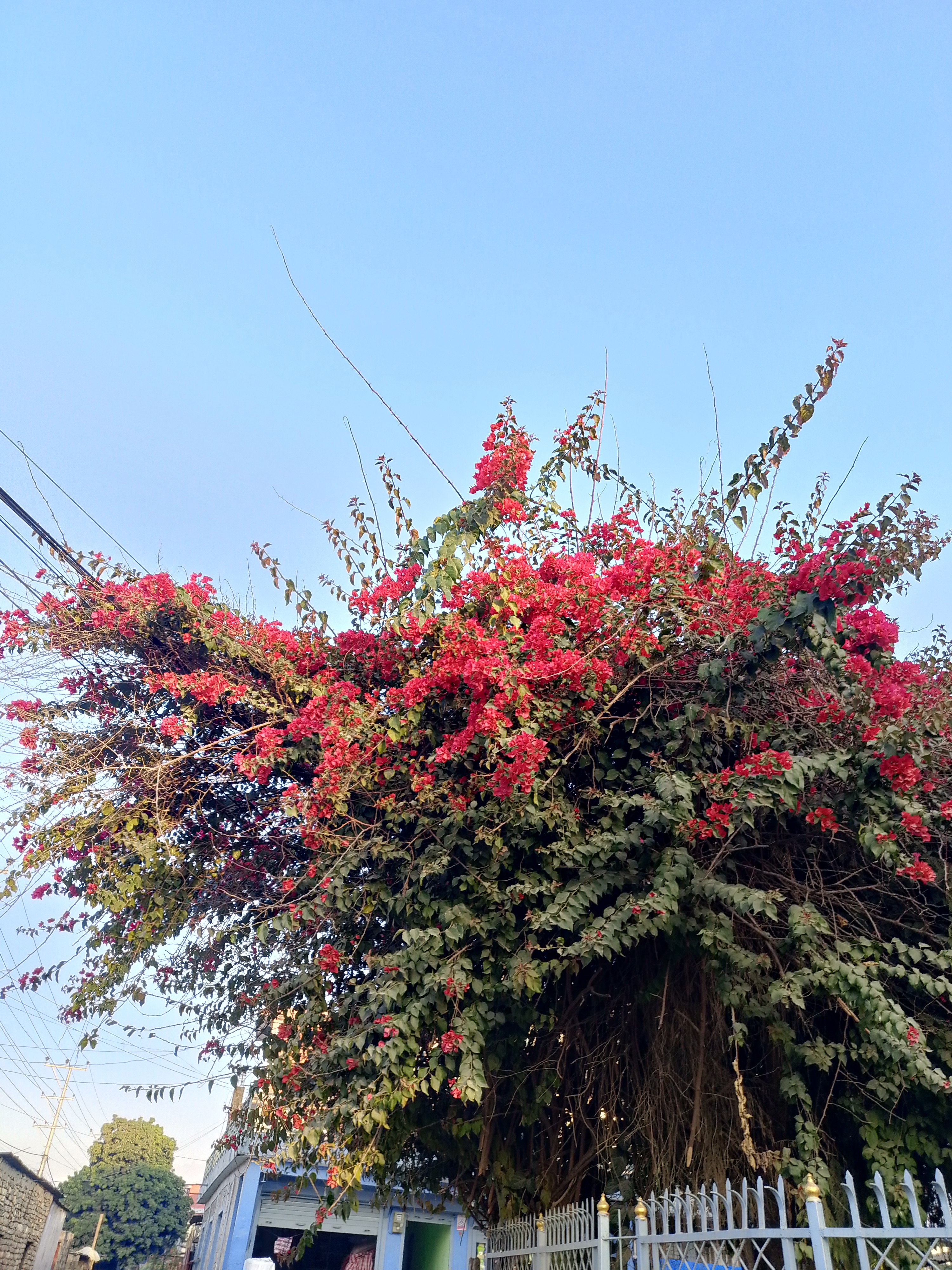 Alternative Text: A picture of a red coloured flowers in a big tree with spread out branches. The background has a blue sky.