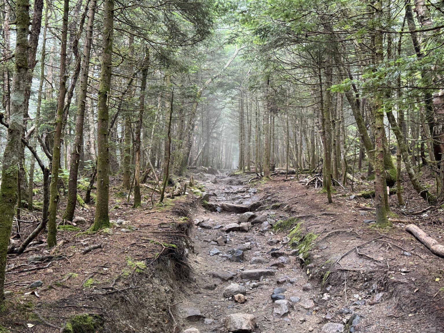 Alternative Text: A rocky trail through the trees with increasing fog up Mount Willard in New Hampshire.