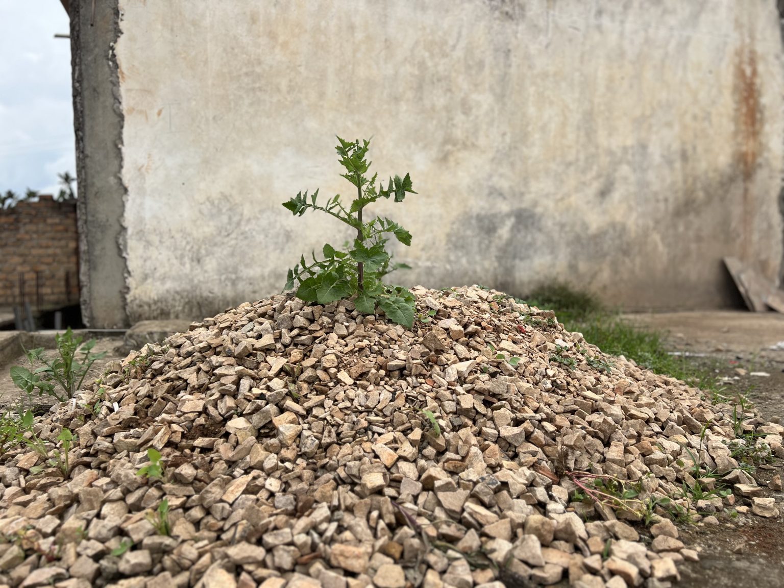 Alternative Text: A small green plant shoots up from the top of a mound of small stones, with a blurred, textured wall in the background.