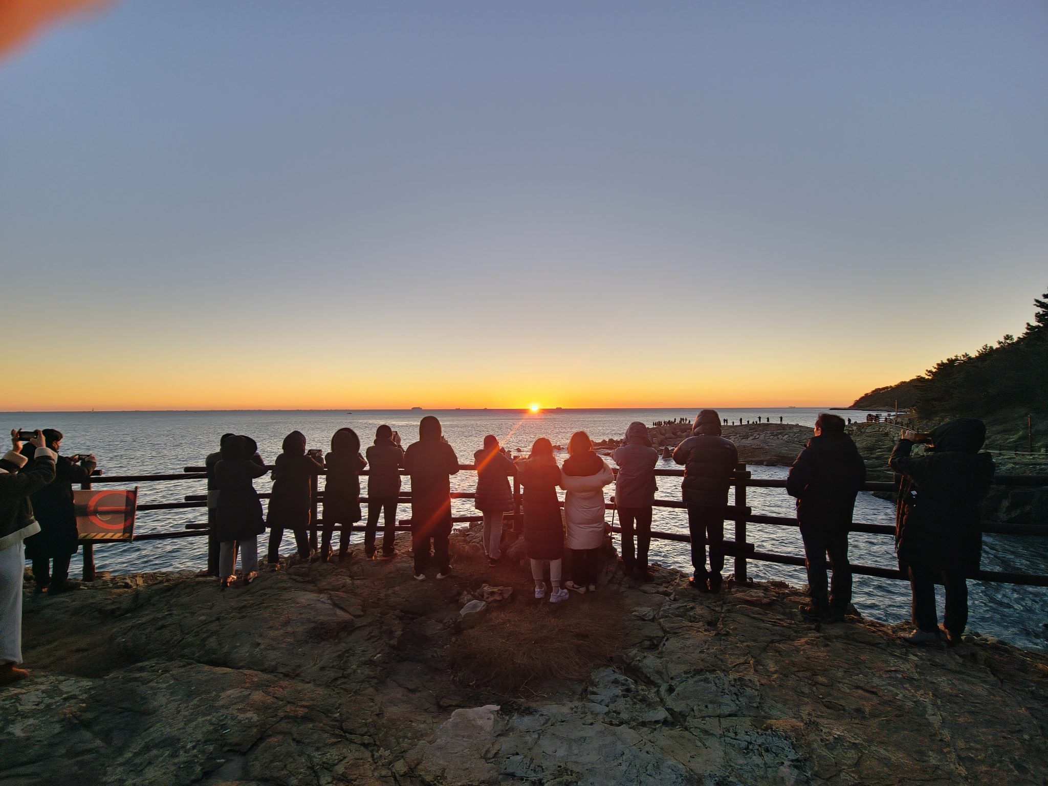 Alternative Text: A group of people stands on a rocky shore, observing a sunrise over the ocean. The sky is clear, and the sun is just above the horizon, casting a warm glow. Igidae sunrise, Busan, South Korea