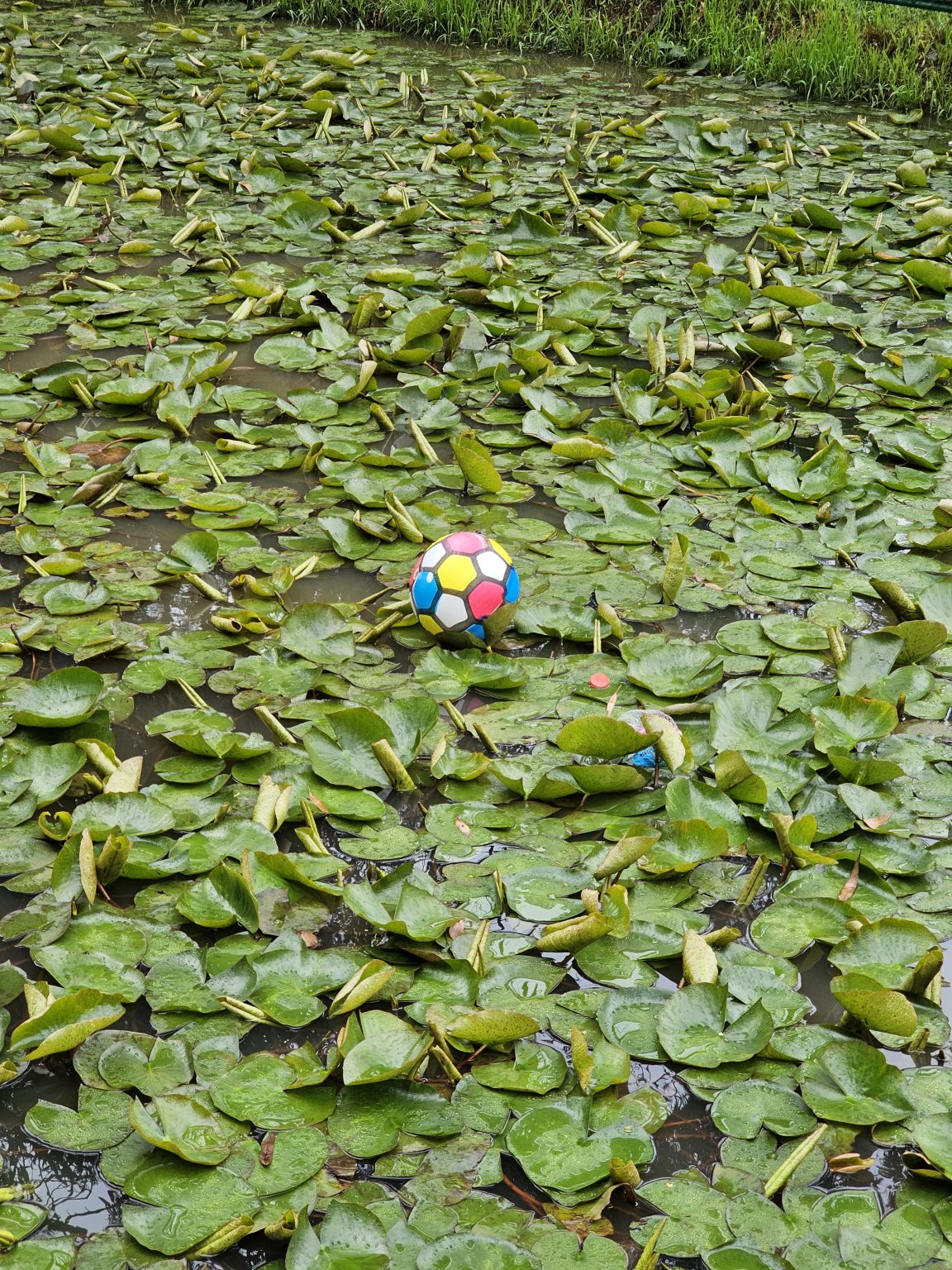 Alternative Text: A colourful ball rests on a bed of lily pads in a pond. The scene is lush with green foliage and the water is calm. Captured from the Government Botanical Garden, Ooty, Tamil Nadu.