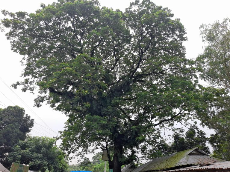Alternative Text: A large tree stands prominently in the center of a village, surrounded by quaint houses and pathways.