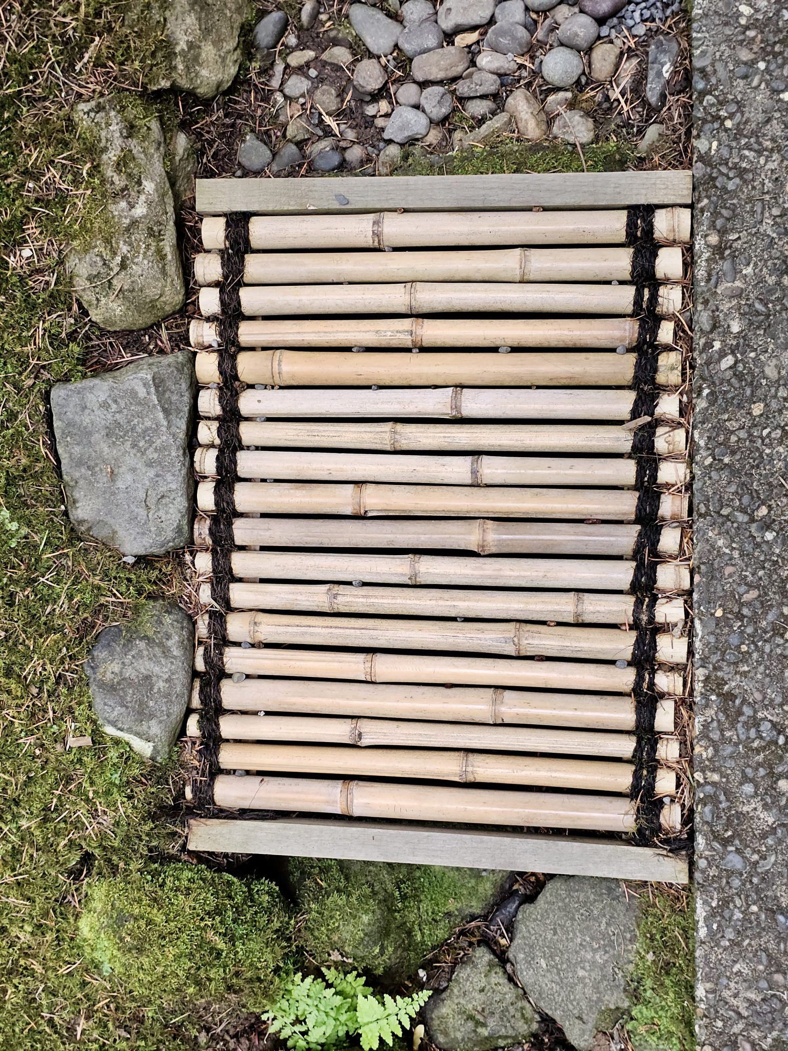Alternative Text: A close-up of a bamboo mat drain framed by moss and stones, used in traditional Japanese landscaping at the Portland Japanese Garden.