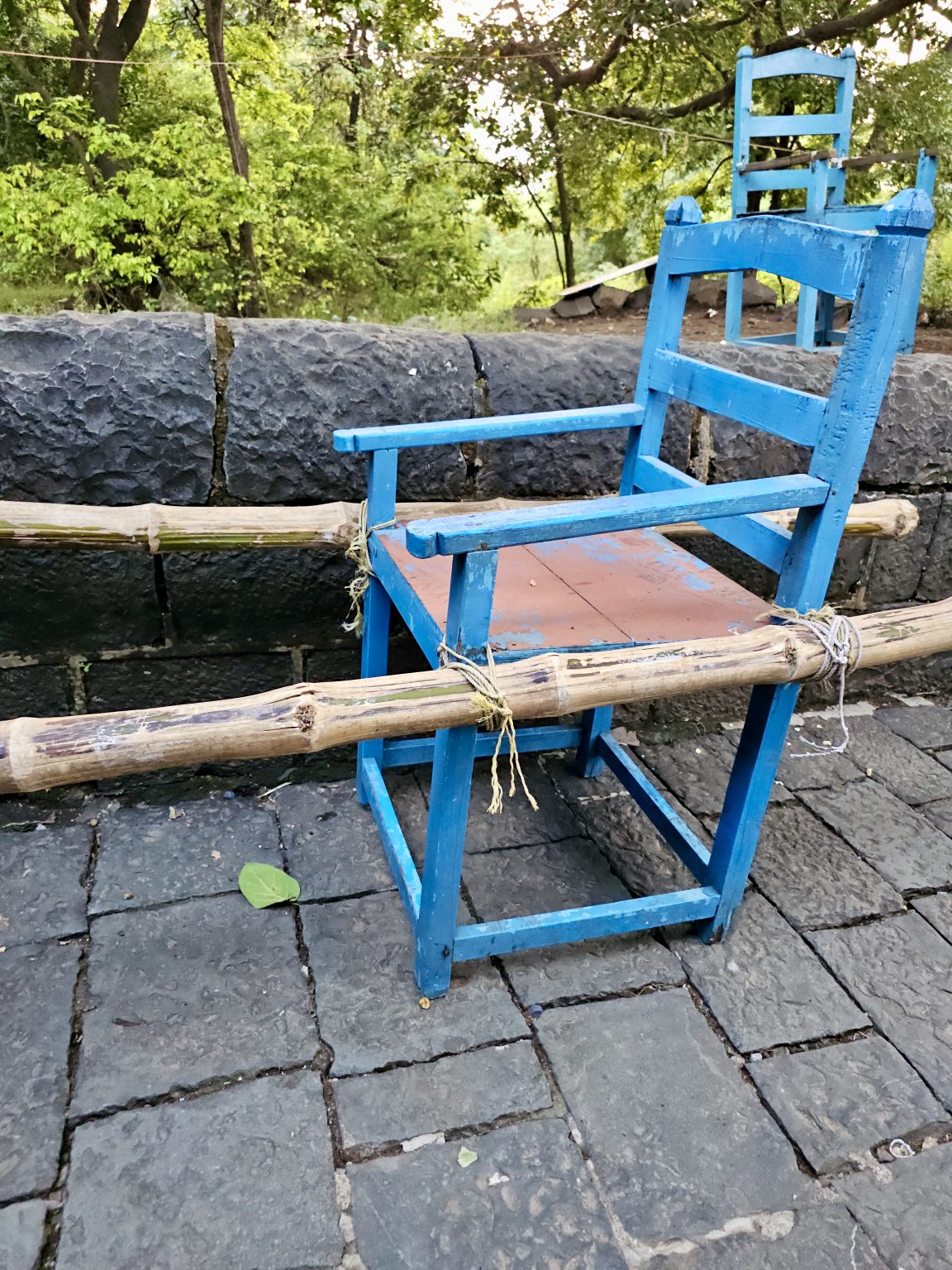 Alternative Text: A blue wooden chair tied to bamboo sticks on a stone path, used for carrying people, in a wooded area near Elephanta caves, Mumbai, Maharashtra.