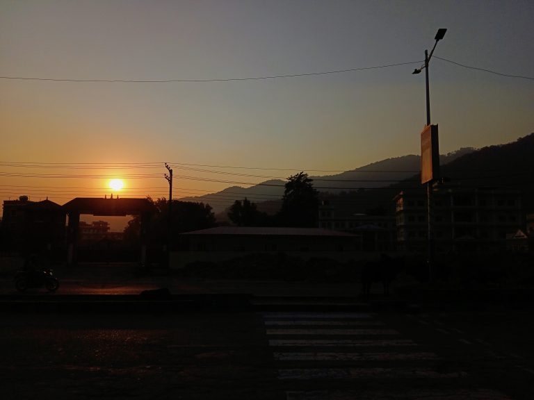 Alternative Text: Sunset over Butwal, with warm orange light behind mountain and building silhouettes and power lines across the sky.