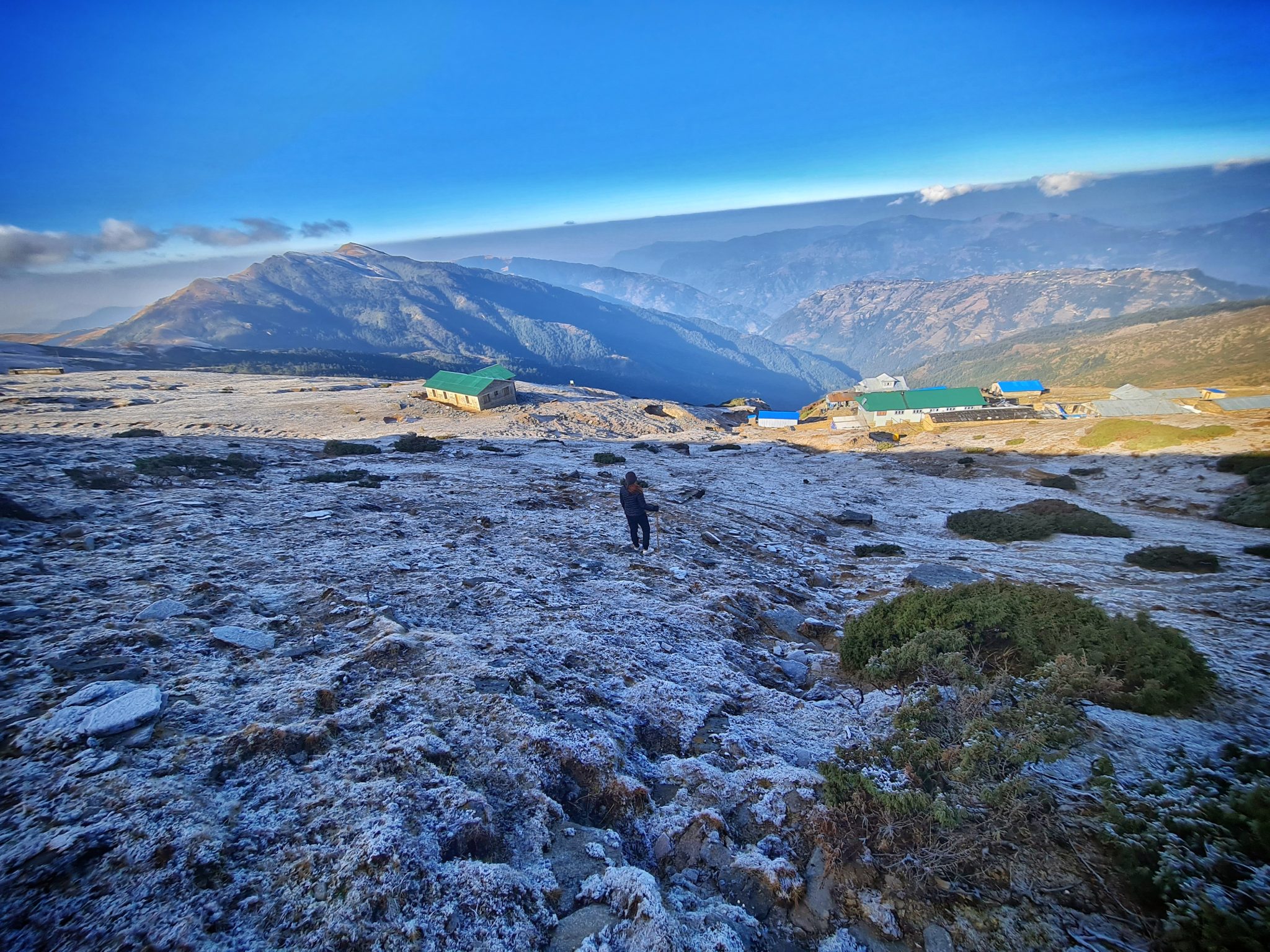 Alternative Text: A person walks down a snow-covered downhill slope, a beautiful mountain, and a clear blue sky in the background.