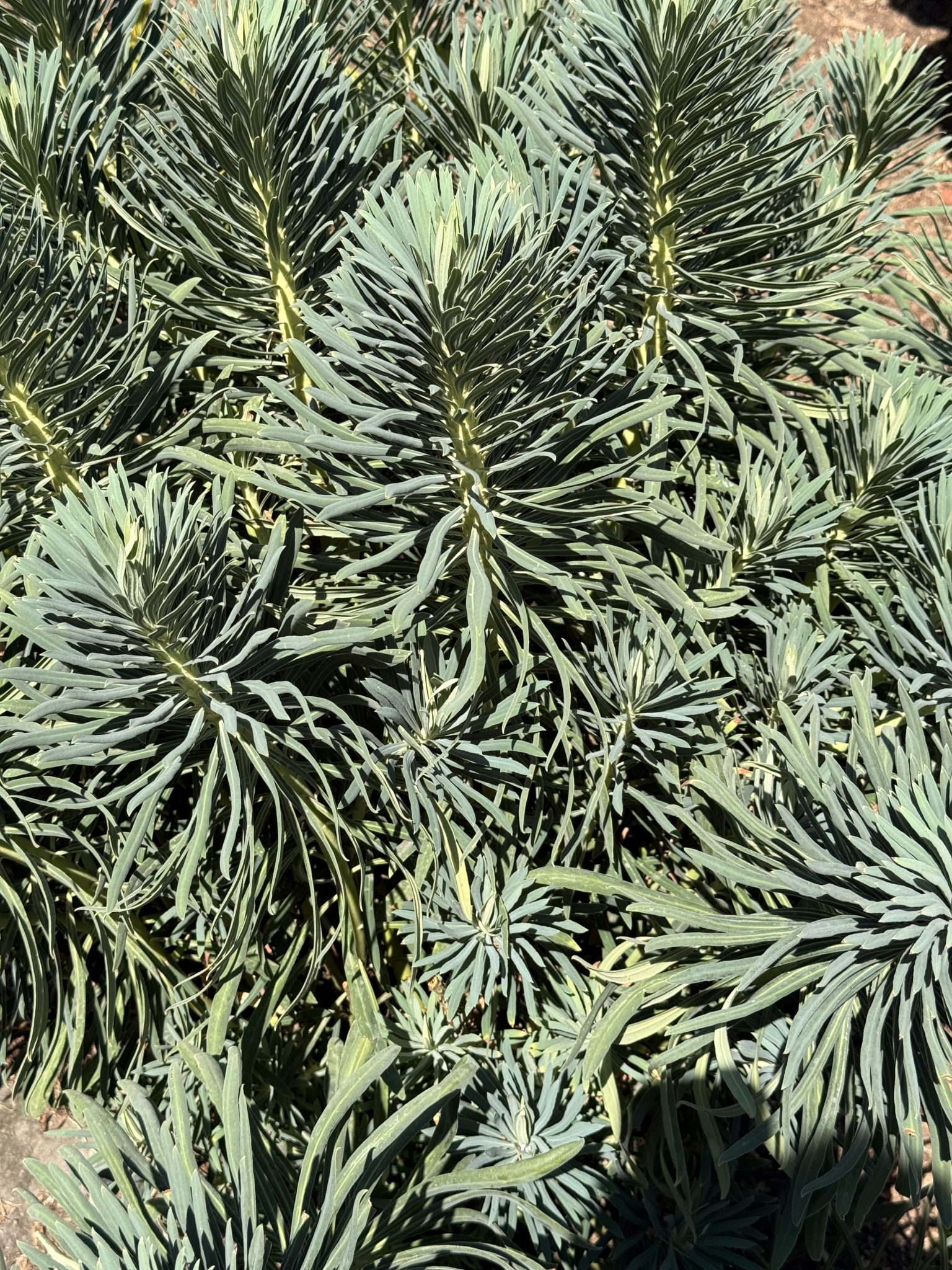 Alternative Text: Dense green foliage of an Euphorbia plant at the Oregon Zoo, Portland. The narrow leaves form soft, spiky shapes that spread out in all directions under bright sunlight.