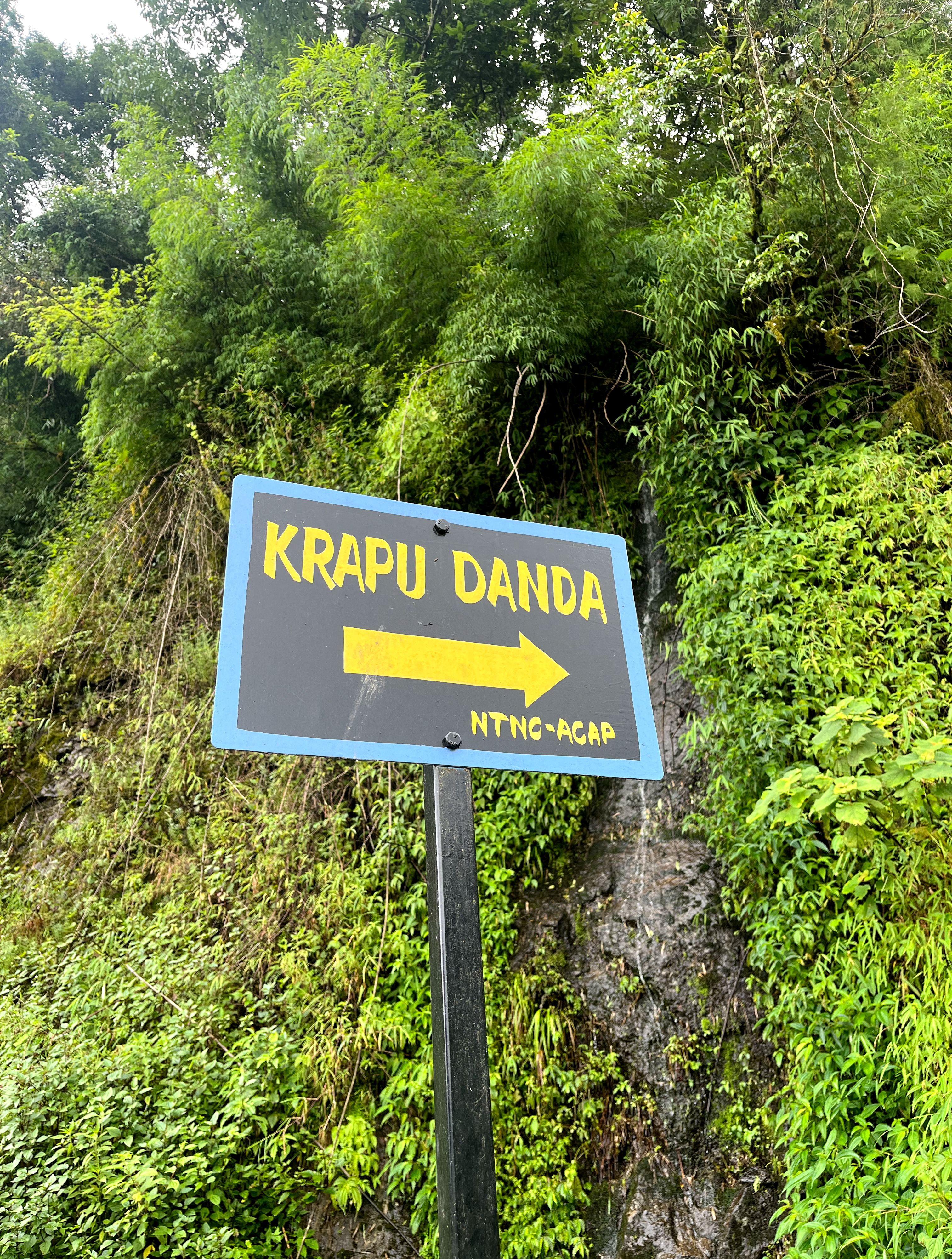 Alternative Text: A directional sign reading “KRAPU DANDA” with an arrow pointing to the right, set against a lush green background of plants and shrubs.