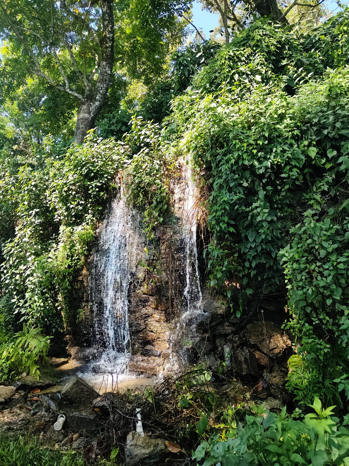 Alternative Text: A serene waterfall cascades over a rocky surface, surrounded by lush greenery and various types of foliage.