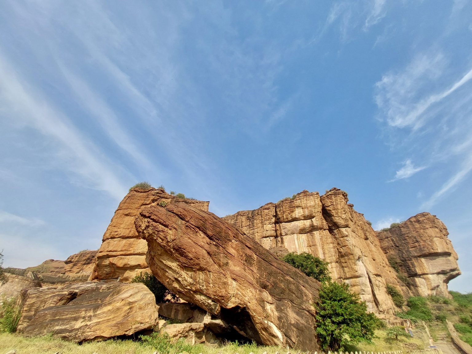 Alternative Text: Sunlit red sandstone cliffs of Badami, Karnataka, with layered textures revealing the passage of time.