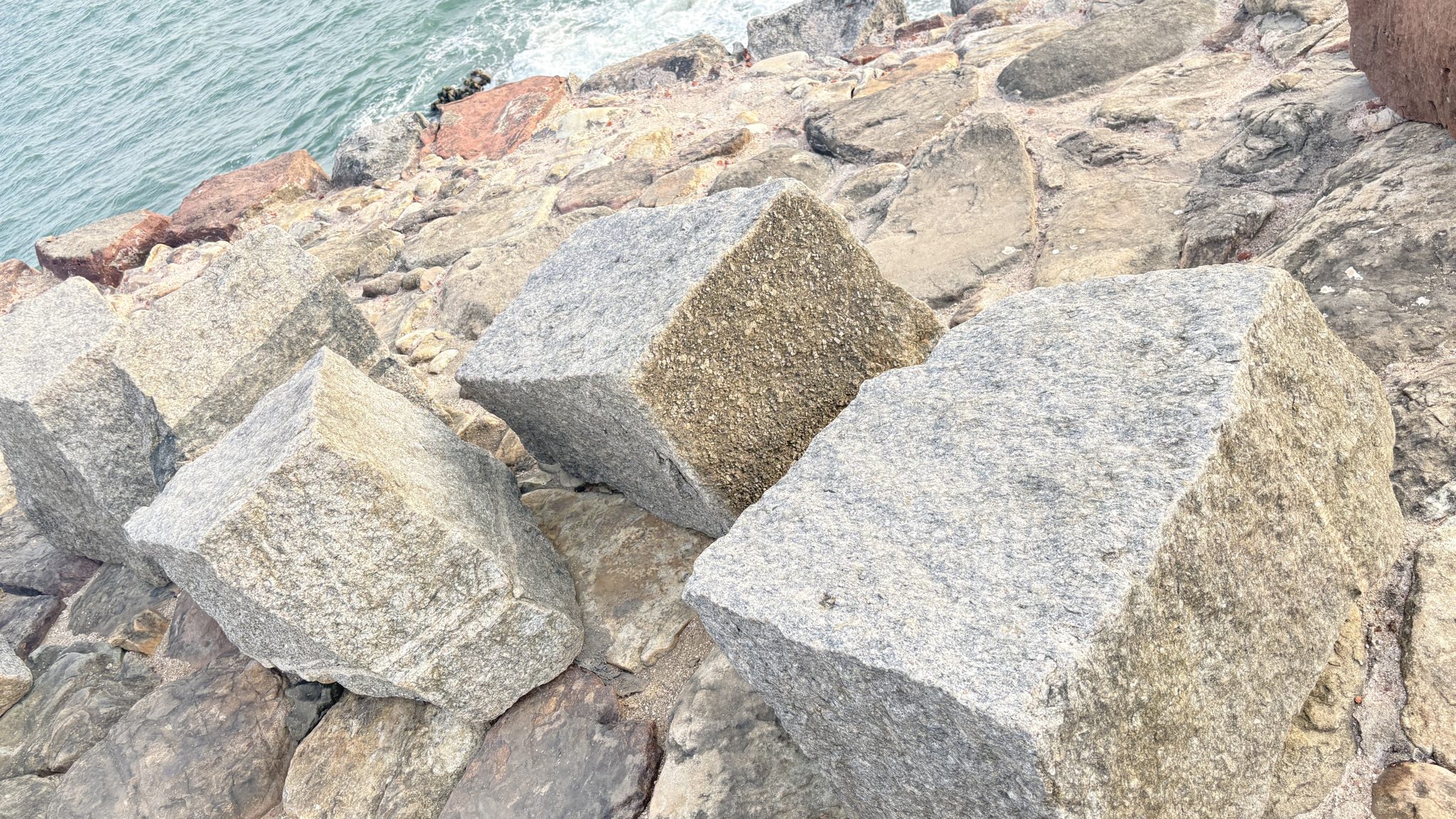 Alternative Text: Three large, weathered stone blocks are positioned on a rocky shoreline with the ocean visible in the background.