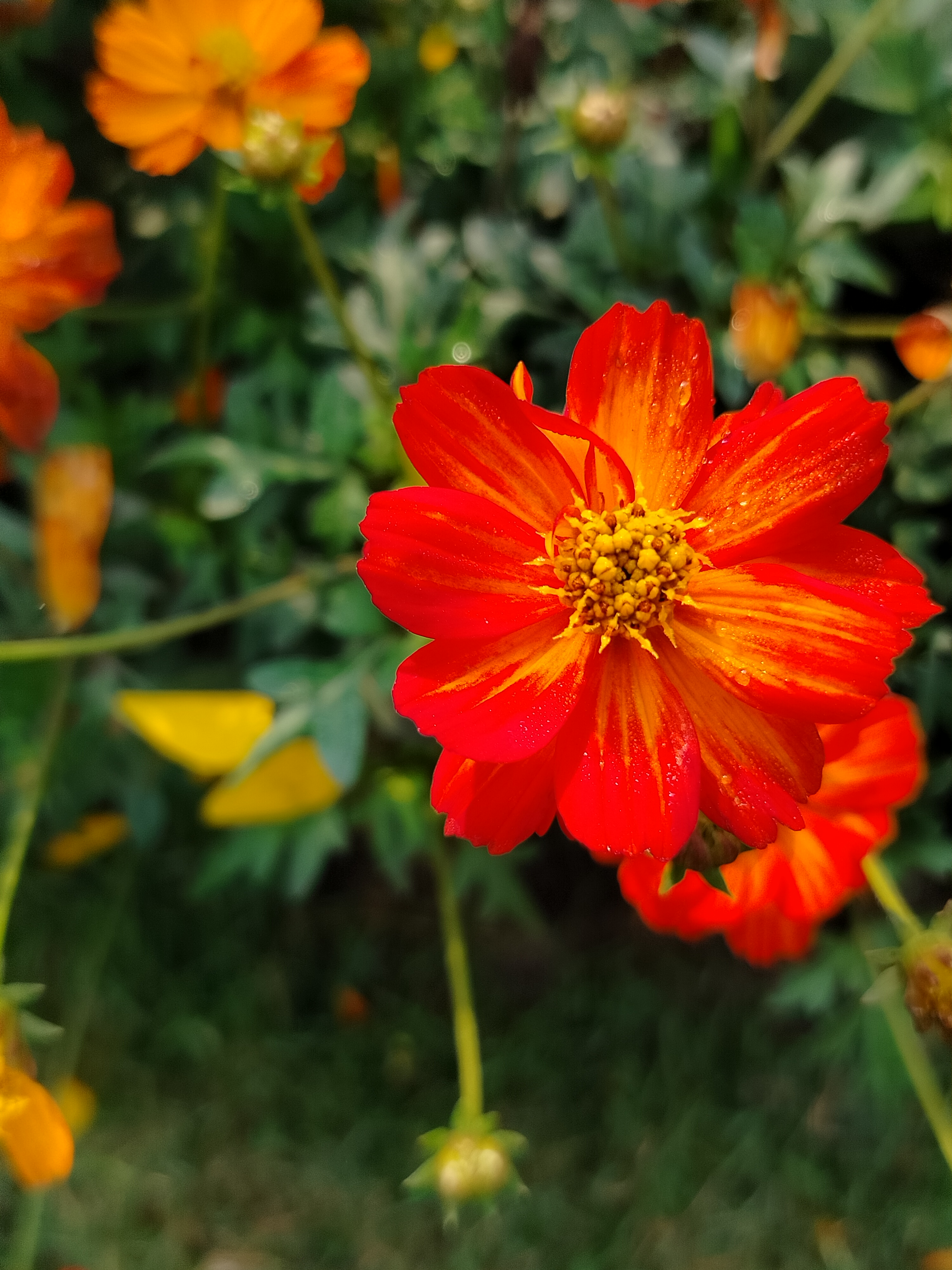 Alternative Text: A close-up of a vibrant orange flower with a striking red-orange hue, featuring a central cluster of yellow stamens.