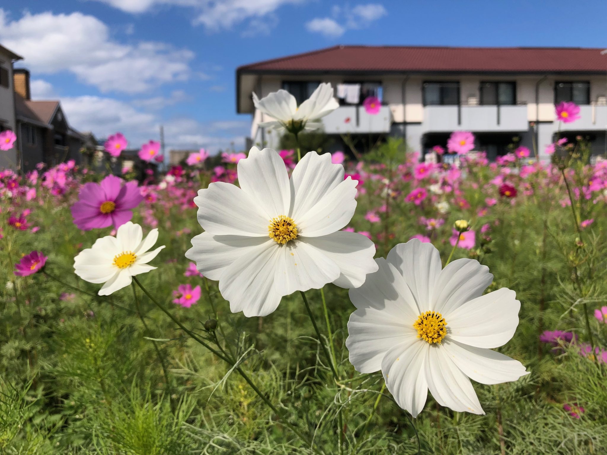 Alternative Text: White and pink Cosmos flowers in a field with more flowers and residential buildings in the background under a partly cloudy blue sky.