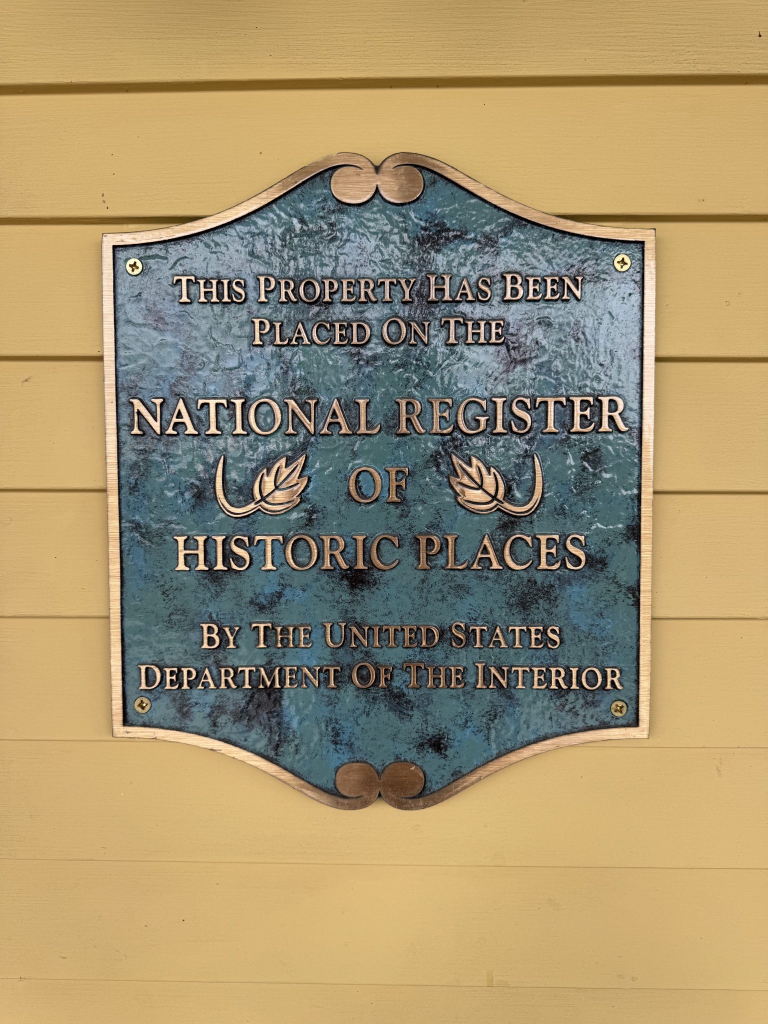 Alternative Text: A green plaque with gold lettering on a yellow wall at the Mountain View Grand Resort & Spa in Whitefield, New Hampshire. It reads “This place has been placed on the national register of historic places by the United States Department of the Interior.