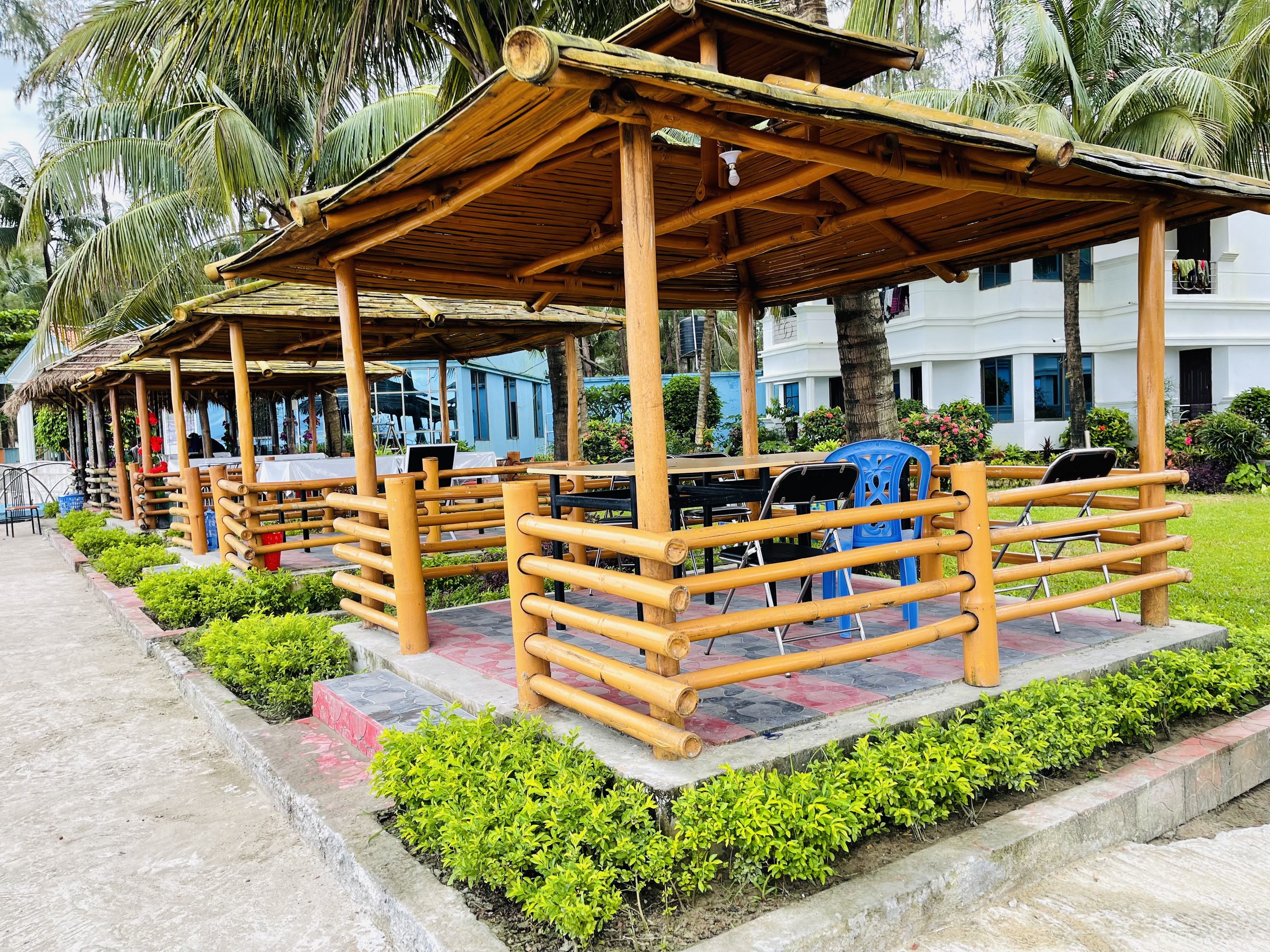 Alternative Text: A series of small, open-air huts with bamboo roofs and railings, each with a table and chairs, set up in a lush green garden at a resort in Cox’s Bazar.