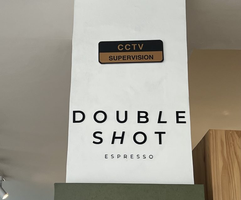 Alternative Text: A sign for a “Double Shot Espresso” on a white wall.