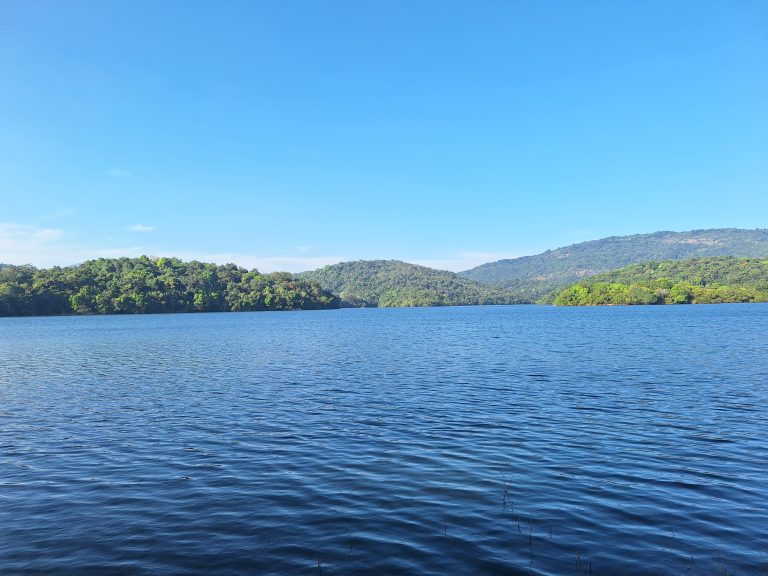 Alternative Text: A serene view of a large body of water surrounded by lush greenery and rolling hills.