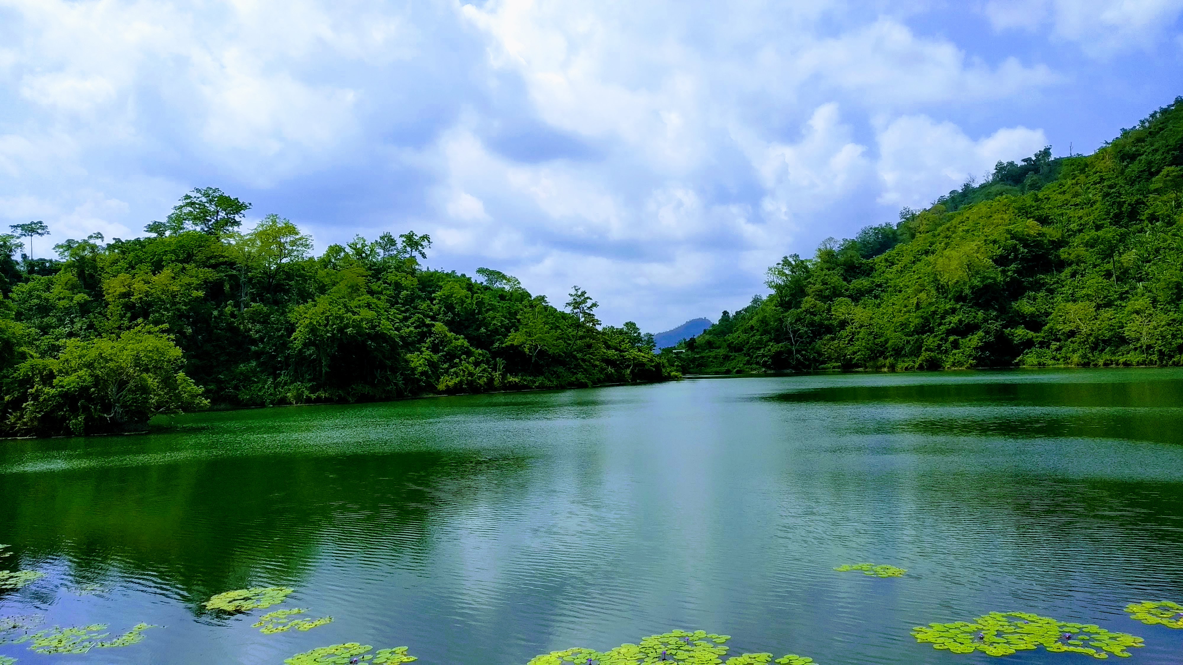 Alternative Text: A tranquil view of Boga Lake in Bandarban, Bangladesh, surrounded by lush green hills under a partly cloudy sky.
