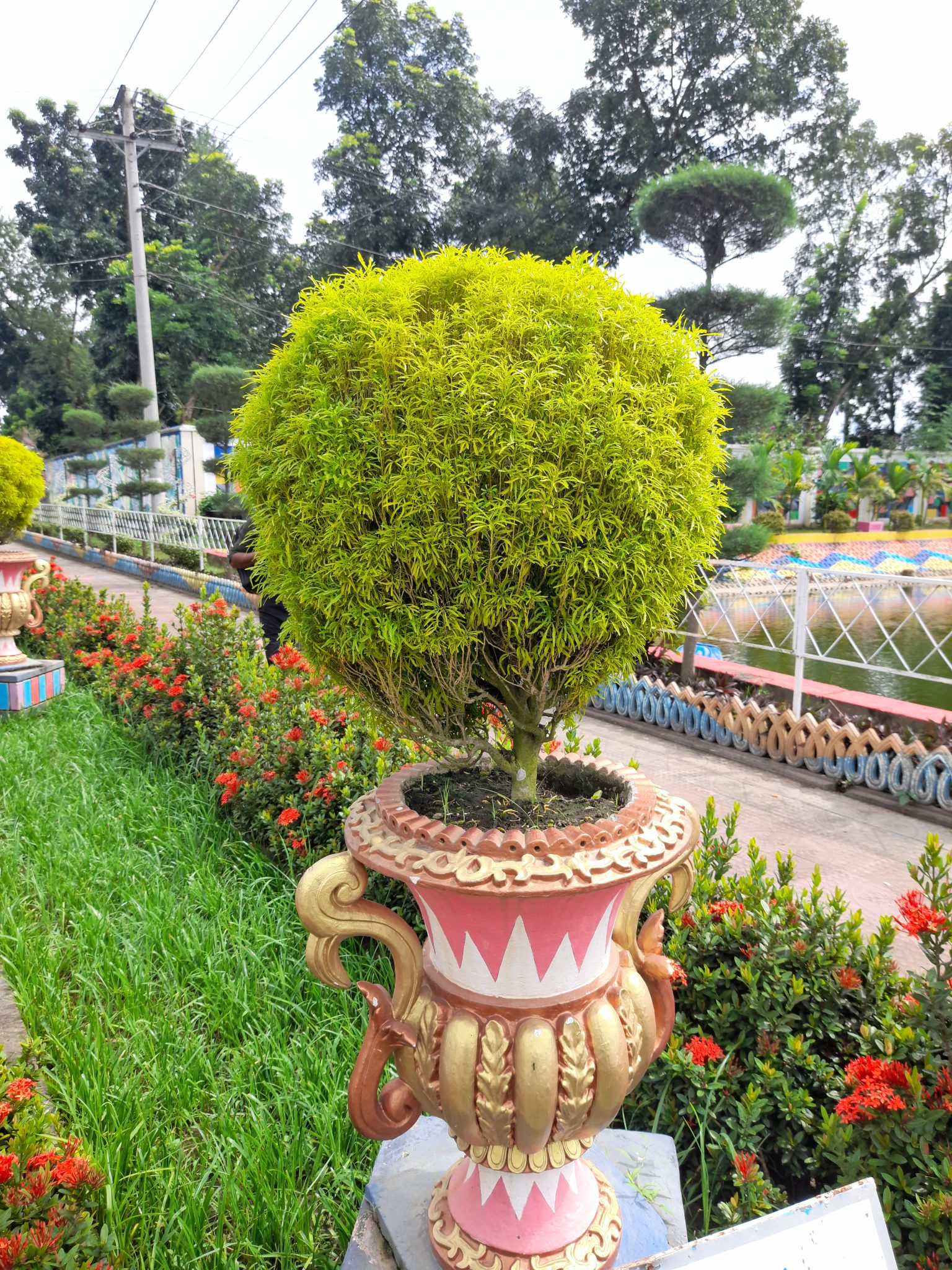 Alternative Text: A vibrant green, spherical topiary is displayed in an ornate planter with pink and gold accents.