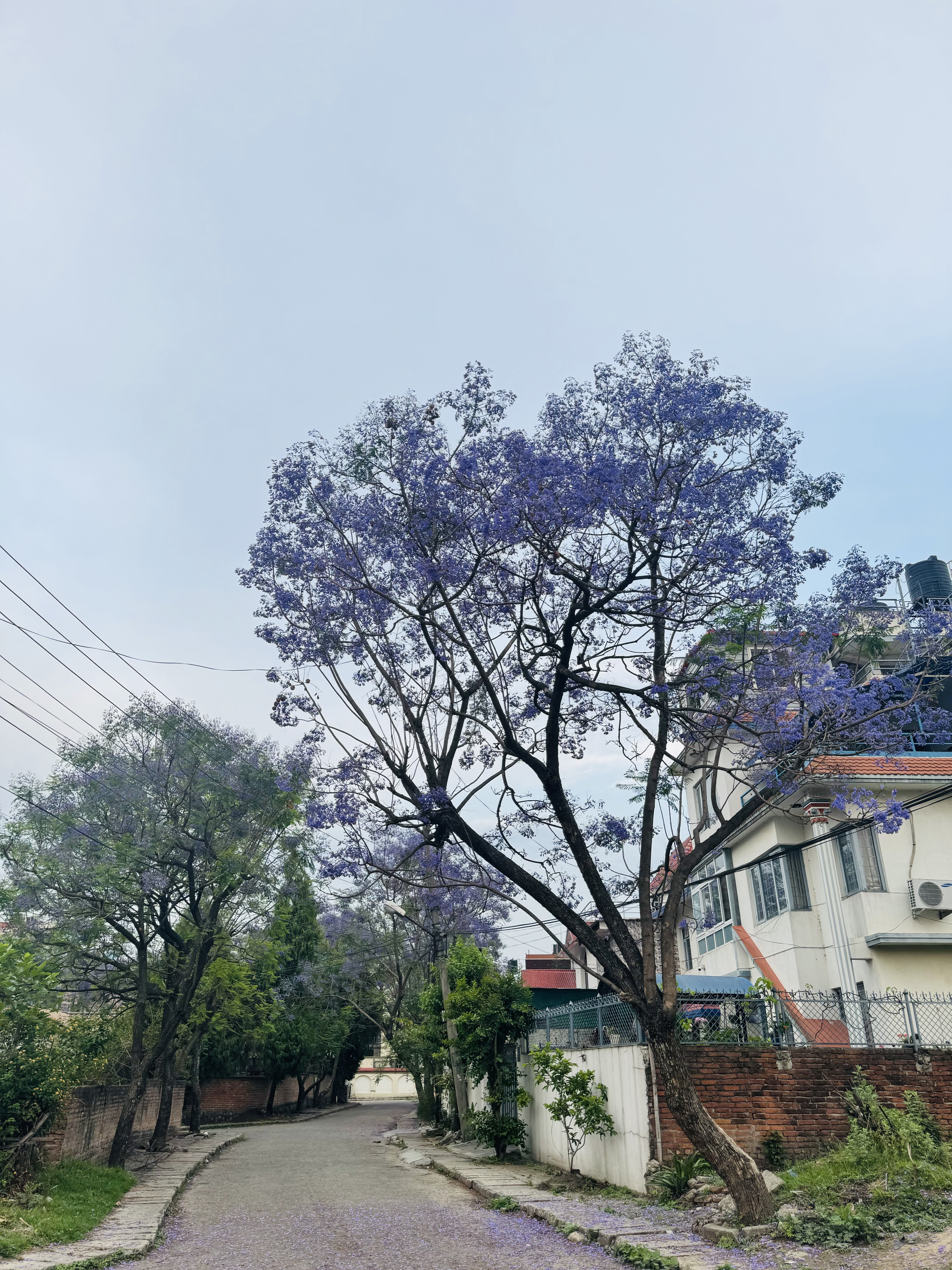Alternative Text: A quiet residential street is lined with Jacaranda trees in full bloom, dropping a carpet of purple blossoms onto the paved road and walkway.