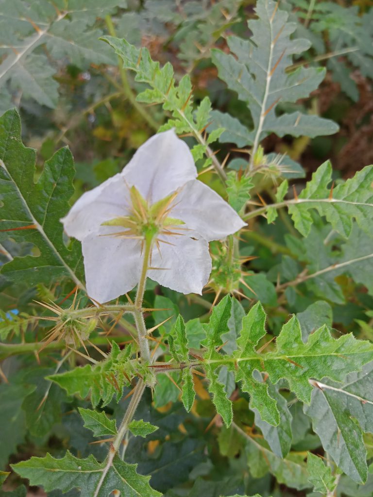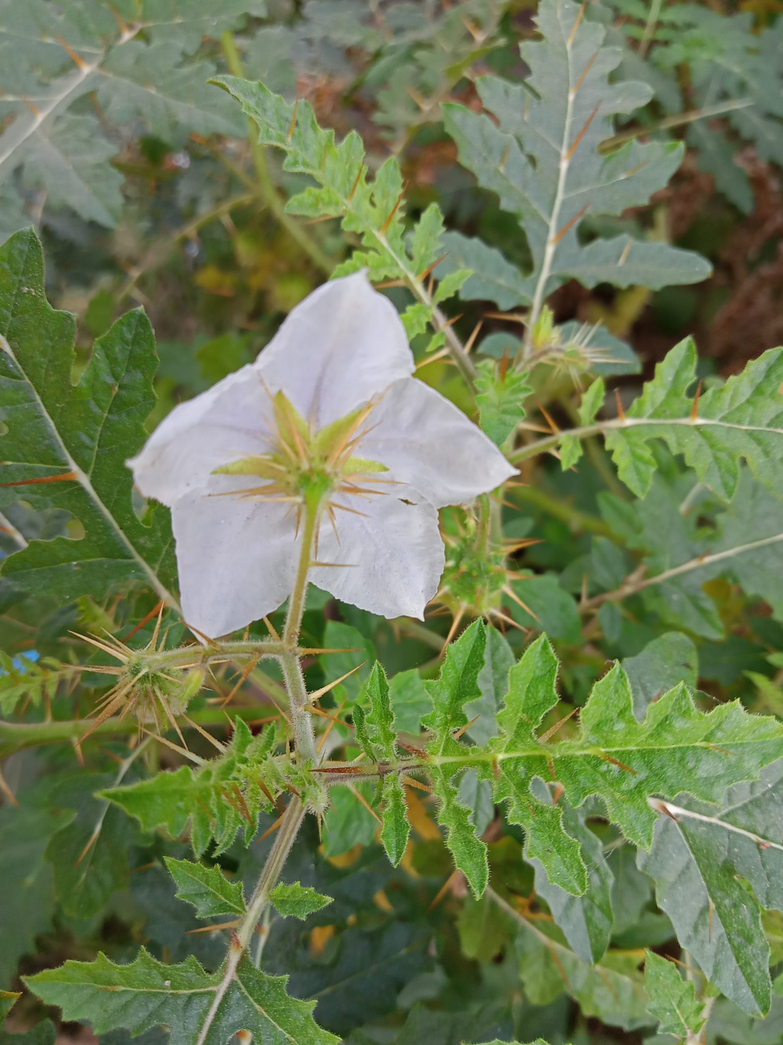 Alternative Text: A close-up of a white flower with pointed petals and a star-shaped yellow center, surrounded by vibrant green, jagged leaves. The plant features sharp thorns along its stem, adding an interesting texture to the composition.