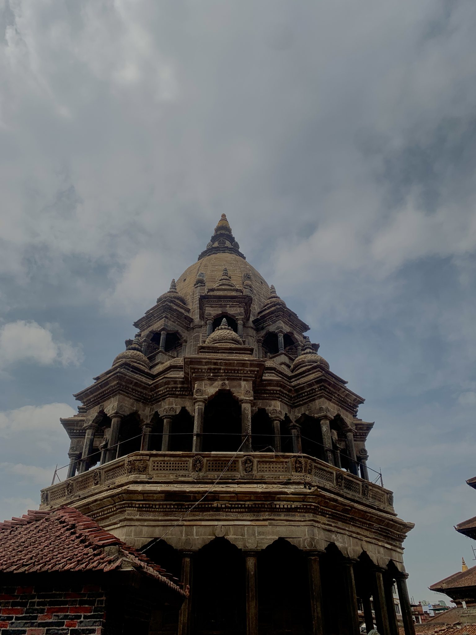 Alternative Text: A tall, intricately designed temple structure rises against a cloudy sky.