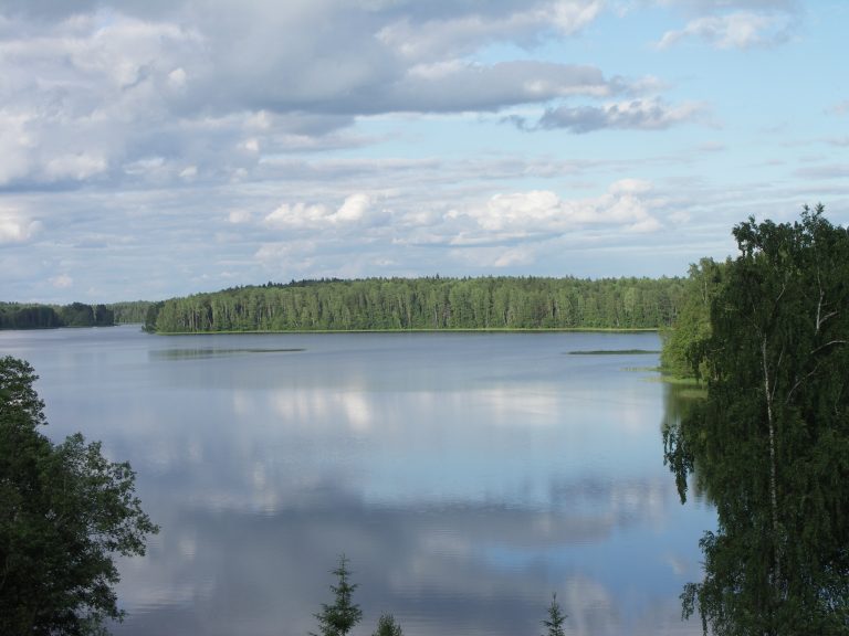 Alternative Text: A serene landscape featuring a calm lake surrounded by lush green trees and dense forest.