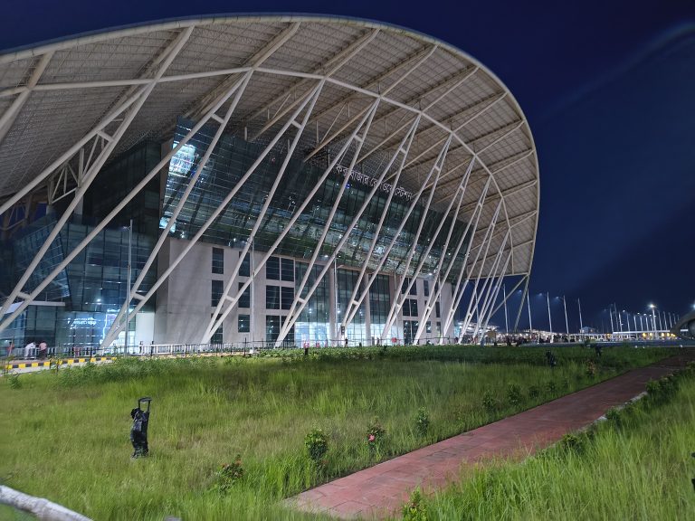 Alternative Text: The picture of a Cox’s Bazar Railway Station taken at night time under the dark blue sky with tall standing lights at its end. The station has a grassy field with cemented road in the middle of it.