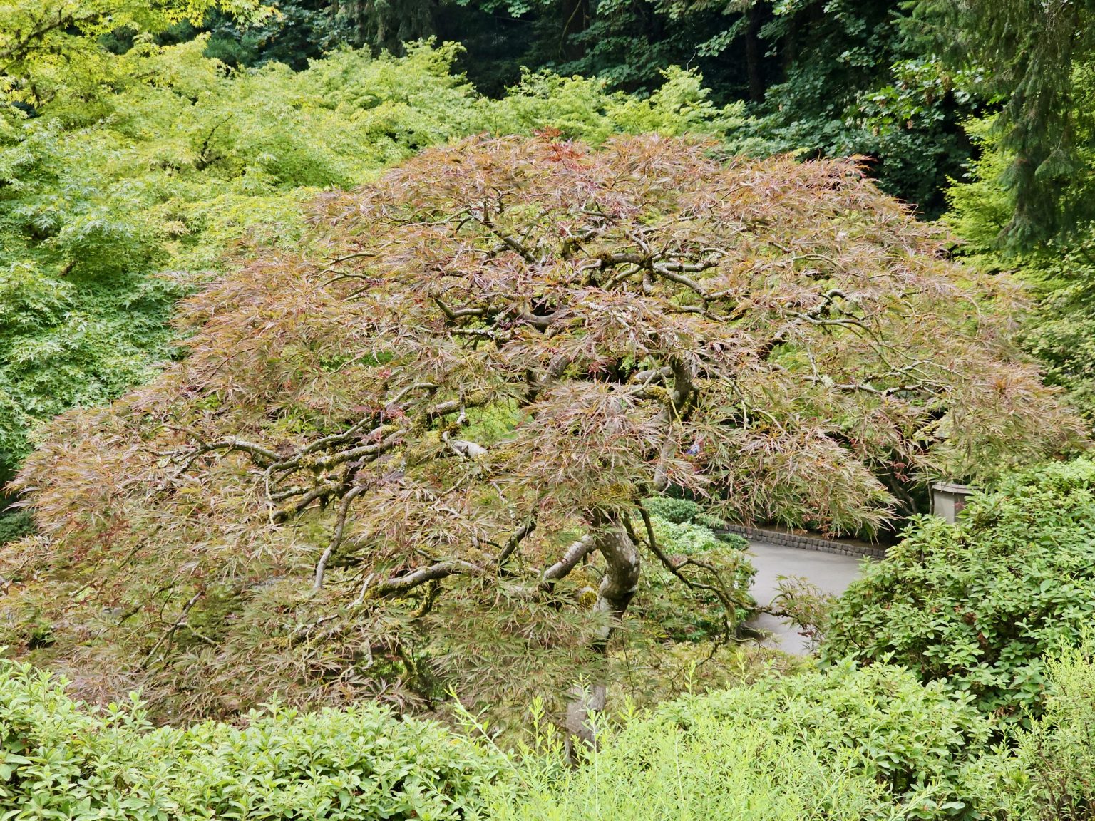 Alternative Text: A large, mature Japanese maple tree with delicate red and green leaves, spreading wide over surrounding bushes. Photographed at Portland Japanese Garden.