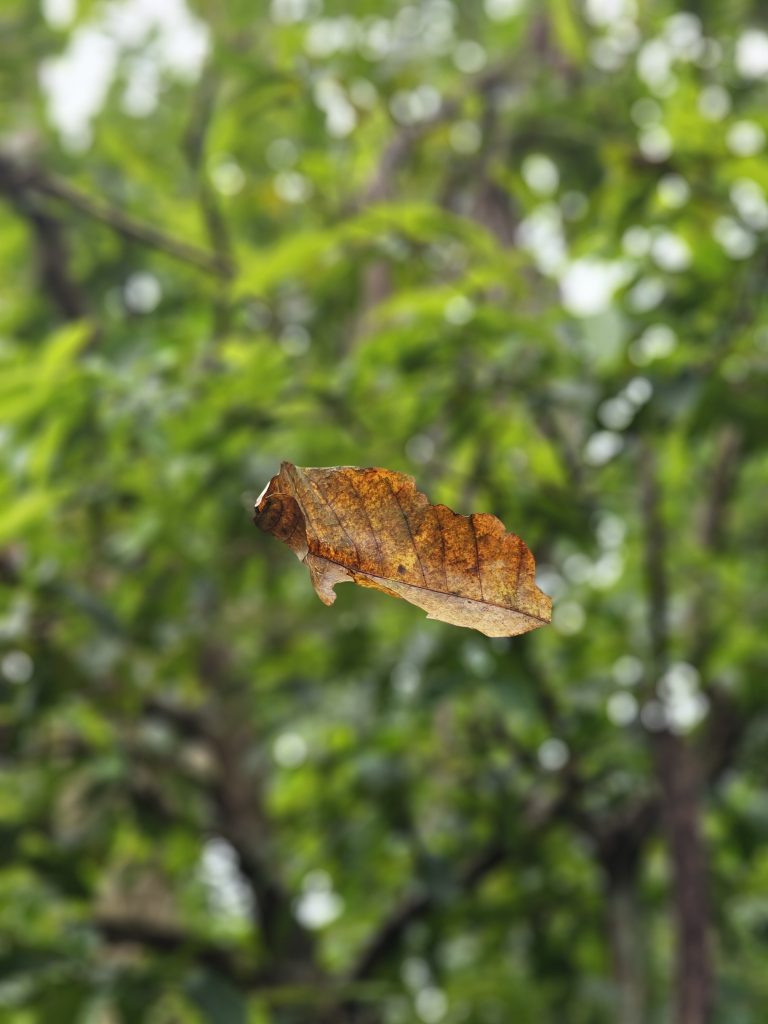 Alternative Text: A single dried brown leaf caught mid-air, seemingly floating with green trees softly blurred in the background. Captured near Thusharagiri Falls, Kozhikode, Kerala.