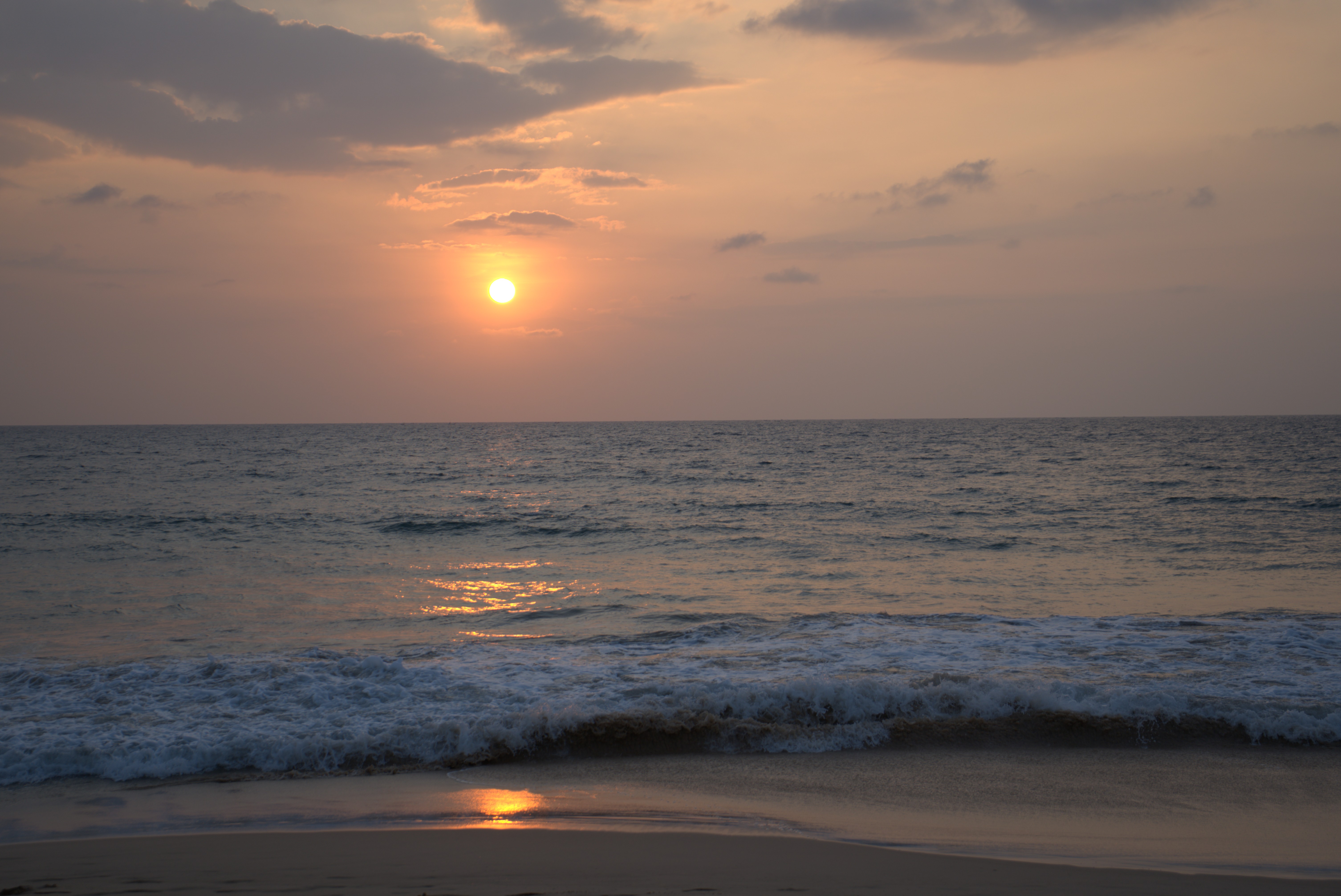 Alternative Text: A warm sunset glows over gentle waves rolling onto a quiet sandy beach.