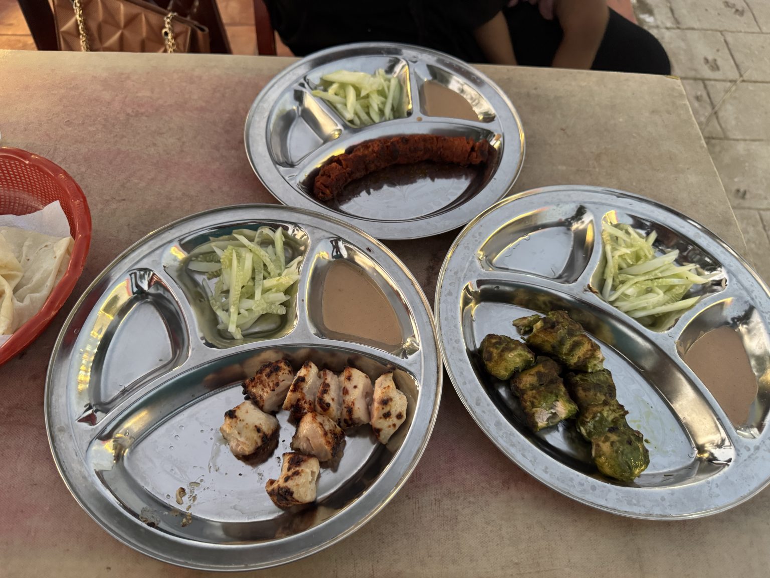 Alternative Text: Three metal plates with grilled chicken, green-marinated chicken, and a reddish kebab, each with cucumbers and sauce.