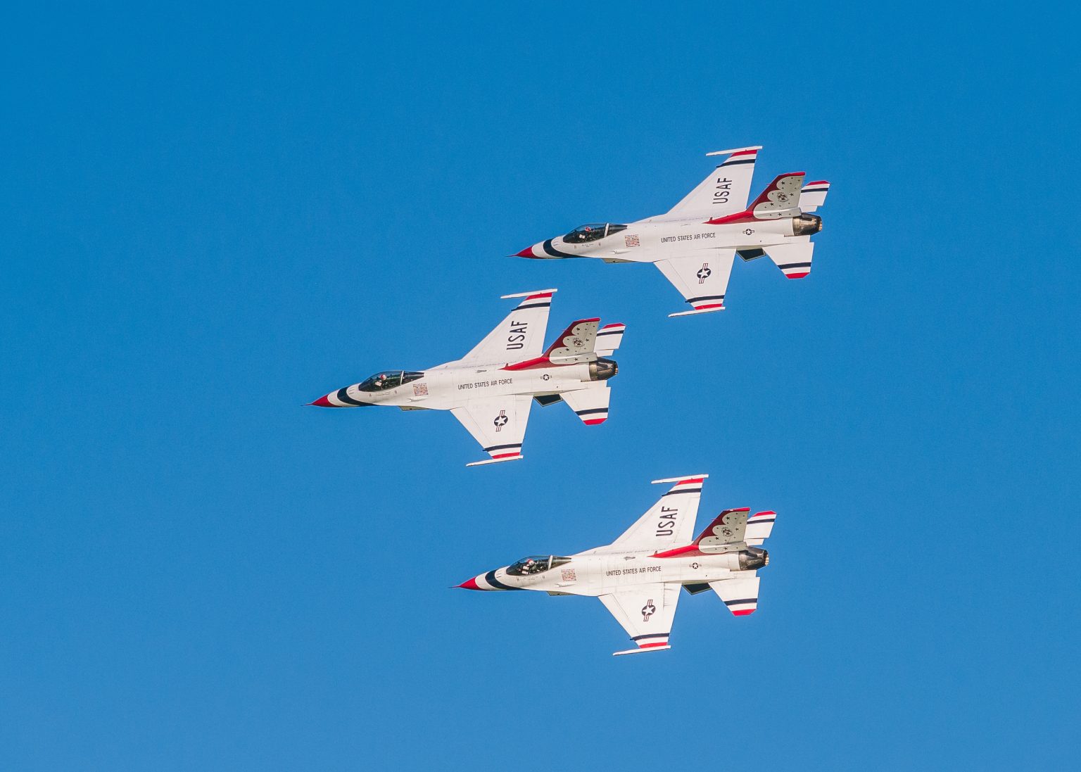 Alternative Text: United States Air Force jets flying in formation at an air show