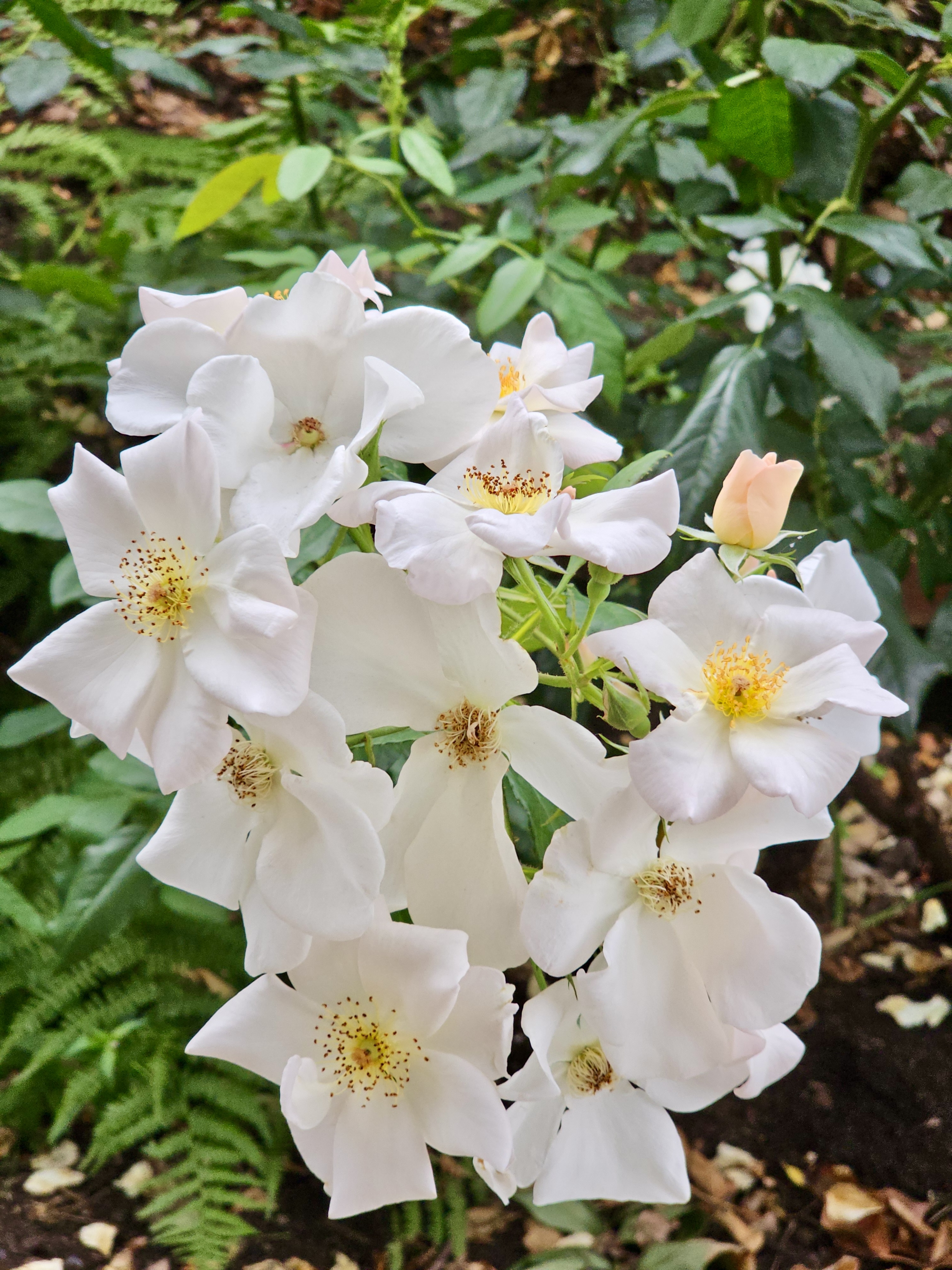 Alternative Text: A bunch of pure white roses with soft yellow centers, blooming in clusters. Photographed in the evening at the International Rose Test Garden, Portland.